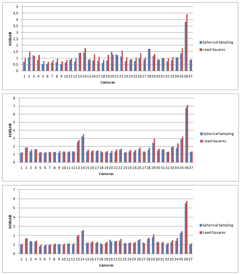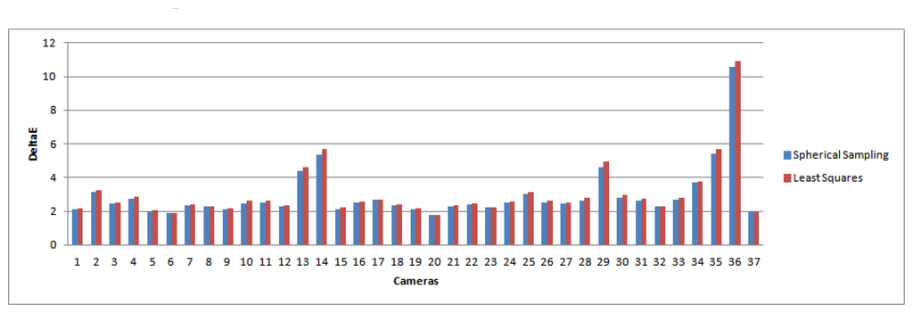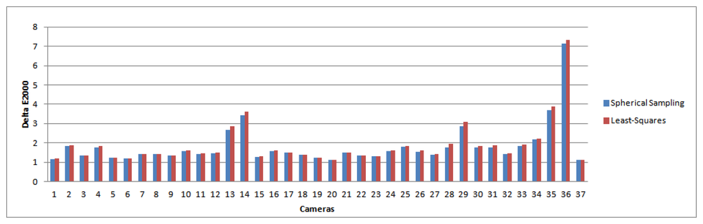 The results for all 37 cameras are reported in Figures 3 and 4 for the ΔE and ΔE00 metrics, respectively. Tables 1 and 2 show error statistics relating to the Figures, presenting the improvement obtained in the minimum, maximum, mean and median statistics. In the Tables, the errors for both the least-squares method and our spherical sampling approach are averaged over all of the cameras.