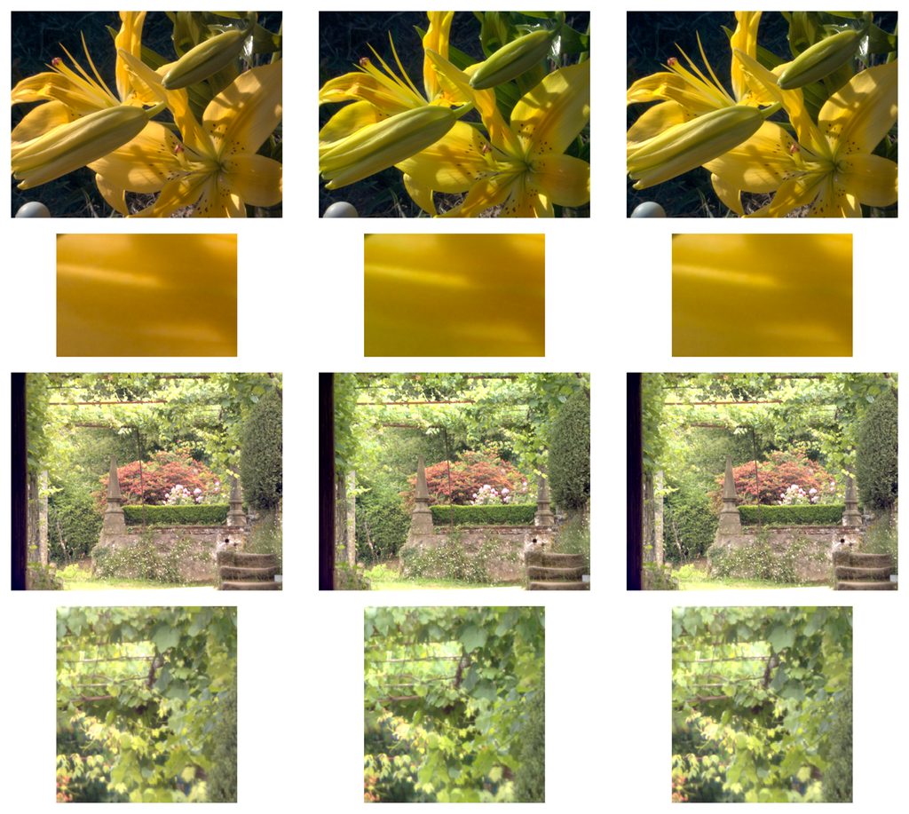 We also present a qualitative example for comparison between the spherical sampling and matrix sampling approaches in Figure 14. In this figure, the spherical sampling images (right), appear closer to the original images (center) than those from matrix sampling (left), especially in the red colors. In particular, for the S-CIELAB case, matrix sampling gives a mean error for the whole image of 1.2823, while spherical the sampling error is 0.7624. In the case of the CID measure, the mean error using matrix sampling is 0.0248, while the spherical sampling error is significantly lower: 0.0076.