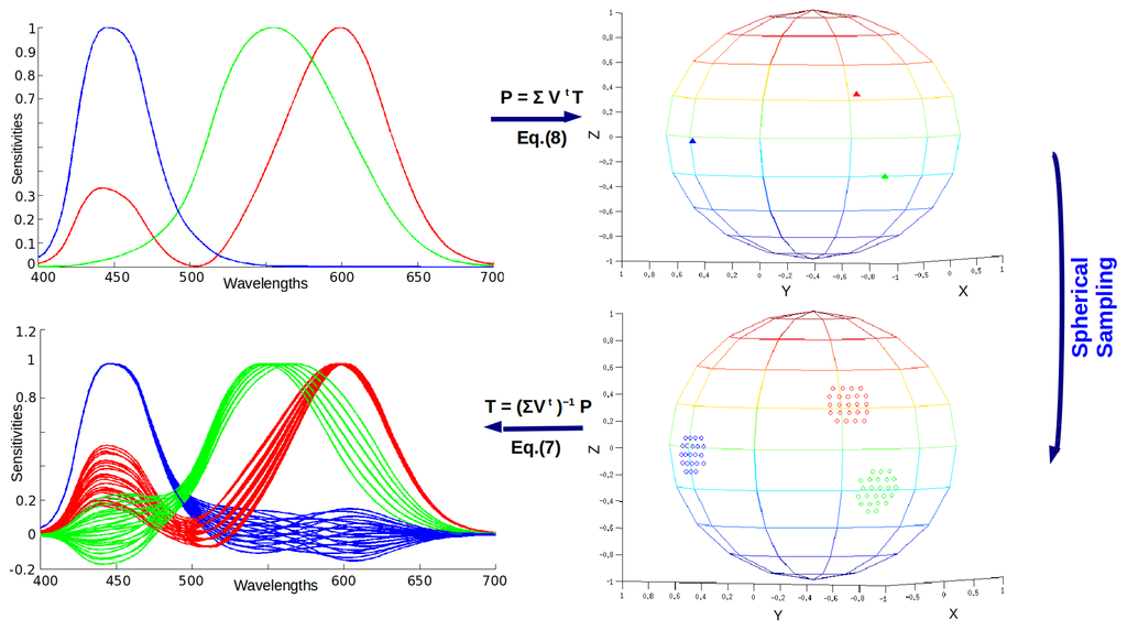 Spherical sampling [11,28,29] provides a means for discretely sampling points on a sphere and relating them to sensors. In particular, given a set of sensors, spherical sampling converts each sensor into a point in the sphere and, from there, samples discrete points on the sphere within a pre-specified angular distance from the starting point. Each of these sample points represents a new sensor. Therefore, for example, given a set of three RGB sensors, these can be mapped to three separate points on a sphere. Multiple points, say 10,000, can then be sampled close to each sensor on the sphere. In this example, this results in 10,000 new R sensors, 10,000 new G sensors and 10,000 new B sensors. A discrete set of plausible sensors can then be generated by enumerating all possible combinations of the R, G and B sensors. These potential sensors can then be compared using an error metric.