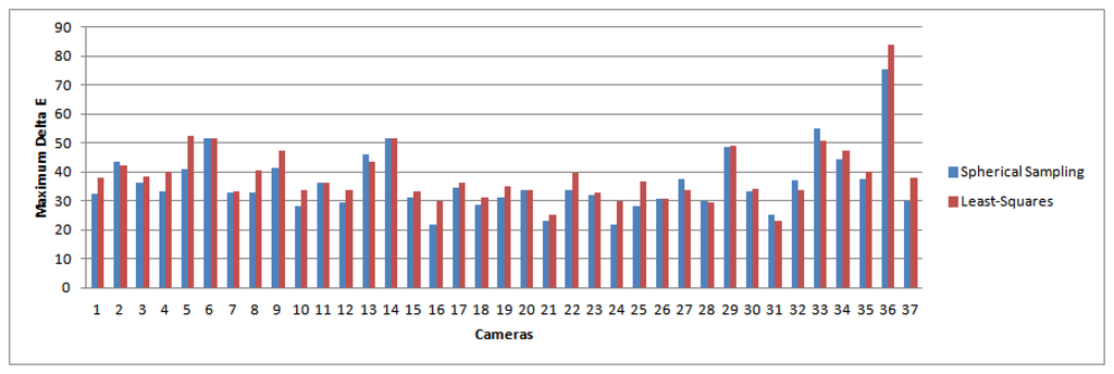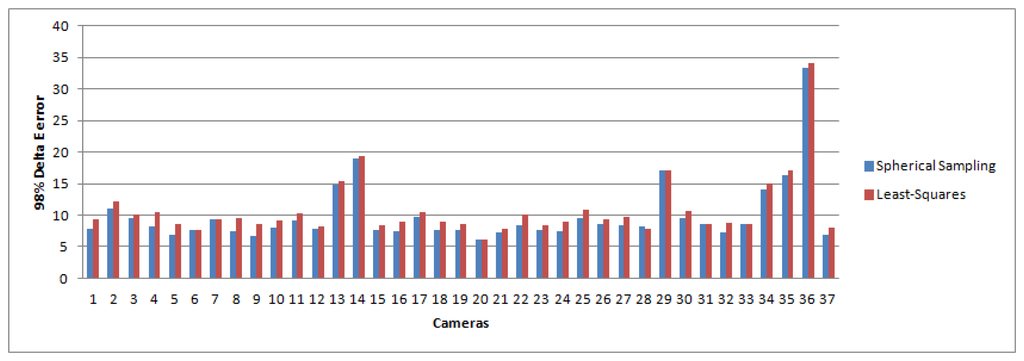 We note that the magnitude in the improvement over least-squares is consistent with other works presented in the color research literature [37,38]. Furthermore, other statistics suggest that the improvement will have a visual impact. In Figures 5 and 6, we plot the maximum and the 98th percentile of error scores for each camera, which show that the spherical sampling outperforms the least-squares approach by a noticeable margin in a vast majority of the cases.