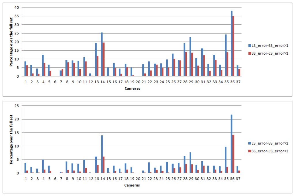 In Table 9, we show the results averaged over all cameras for all three sensors in the three different experiments. In this case, we have performed the minimization of the three measures on the full set of images, i.e., we do not separate training and test data, since the metric we are computing is different from the metric used to learn the transforms. We can see that the spherical sampling technique results in lower error than the least-squares method in 15 out of 18 cases, which reinforces the adequacy of our method.