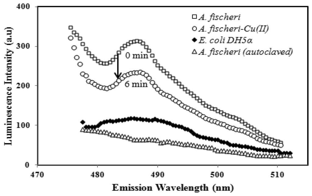 In the absent of toxicants, the immobilized A. fischeri was found to give the highest lumimescence intensity at 487 ± 2 nm. The biosensor response at 487 ± 2 nm declined after incubation with 0.1 mg/L Cu(II) ion for 6 min, which was ascribed to the reaction of Cu(II) ion with the carboxylic acid functional groups of the bacterial cell, thereby inhibiting the cell metabolism. No luminescence responses were expected for either the non-fluorescent E. coli DH5α species and autoclaved A. fischeri, as the A. fischeri cells would have undergone sterilization, and were entirely destroyed.