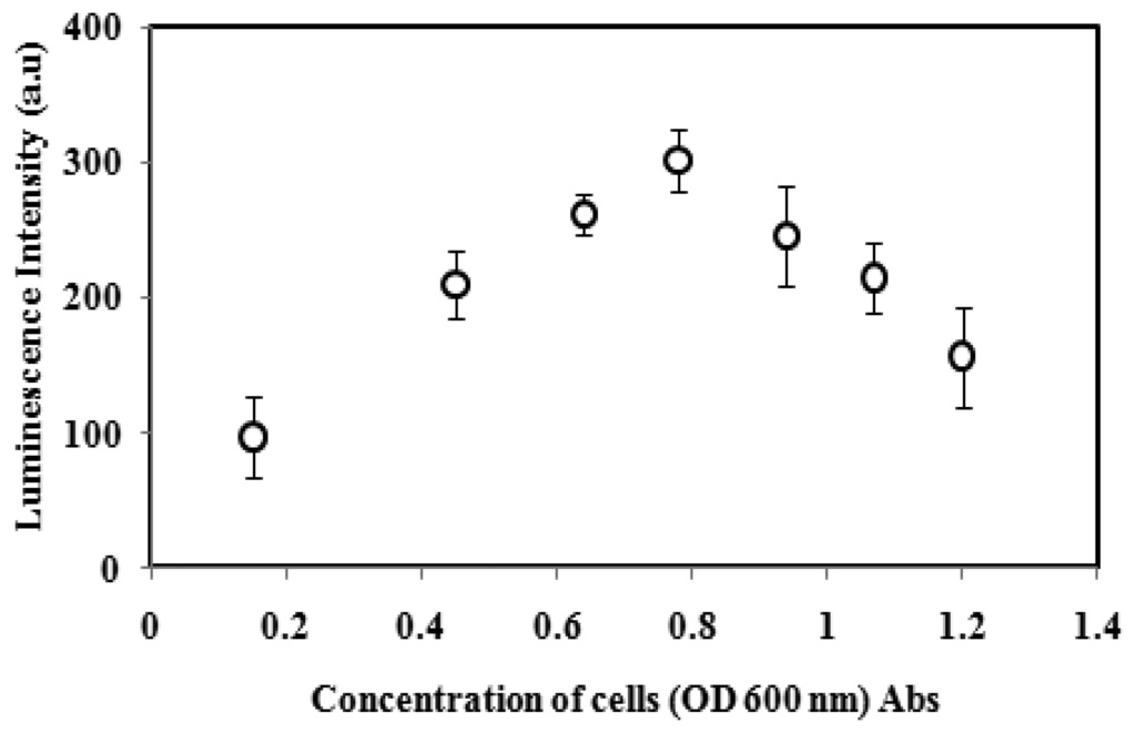 Optimization of bacterial cell loading in the alginate microspheres has been carried out in order to obtain the maximum luminescence intensity of the biosensor. As Figure 2 implies, the luminescence response of immobilized A. fischeri gradually increased with cell concentration from 0.15 to 0.78 OD at 600 nm due to the high rates of the enzymatic chemiluminescent rections. With further increases in the A. fischeri cell concentration from 0.94 to 1.22 OD, the luminescence response of the biosensor decreased because of the limited diffusion of oxygen into the high cell population alginate microspheres, which affected the metabolic activity of the bacterial cell for the normal production of DNA, RNA and enzymes [26,27]. Luminescence quenching of the microbial biosensor may also occur when too many bacterial cells are loaded into the alginate microspheres causing luminescence absorption by neighbouring A. fischeri cells and less energy to be emitted as a light quantum [27,28]. Therefore, the optimum cell concentration at OD of 0.78 to 0.80 (600 nm) was used for further experiments.