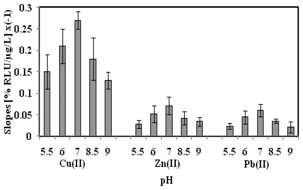 The pH effect on the microbial biosensor sensitivity was investigated using Cu(II), Zn(II) and Pb(II) toxicant solutions at different pHs from pH 5.5 to pH 9.0 (Figure 3). The highest biosensor sensitivity was achieved at pH 7.0, whilst relatively low biosensor sensitivity was observed in slightly acidic and alkaline toxicant solutions. At lower pH conditions, i.e., <pH 7.0, the chromophores of A. fischeri cells were protonated, whereby the carboxylic acid functional groups reacted with the abundant cationic metal ions and this interfered with the enzymatic chemiluminescent rections, thereby influencing the biosensor sensitivity [29,30]. At basic pH values, deprotonation of the chromophore resulted in amino acid chain disorder in the cells, and the bacterial cells were deactivated [31,32]. Thus, the toxicant solution pH was maintained at pH 7.0 for subsequent toxicity biosensing of heavy metals.