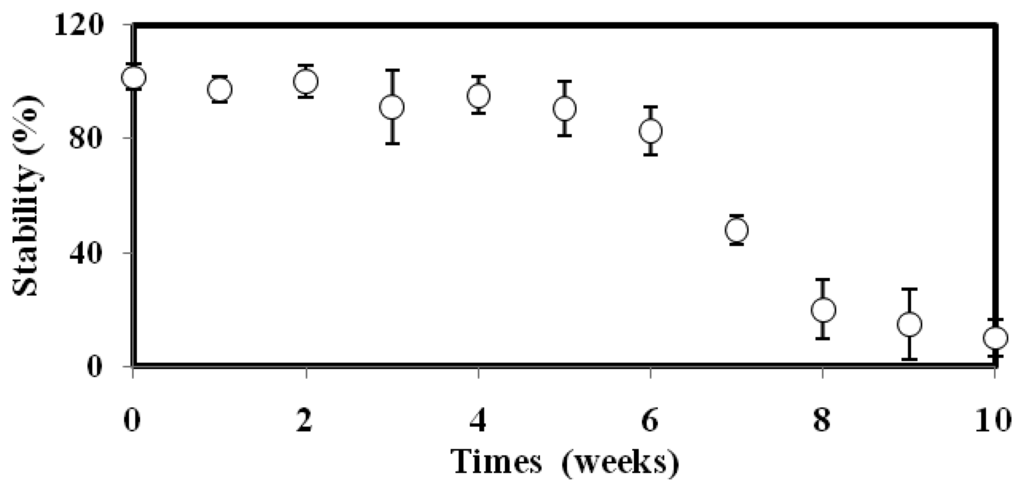 The stability of the microbial biosensor as a function of time is portrayed in Figure 4. The biosensor maintained its 100% luminescence response for the first 5 weeks, and still managed to retain almost 90% of its original response in week 6. After that, the biosensor response was slowly reduced until the tenth week, when only a 10% bioluminescence response could be captured. This observation can be explained by the fact that the available nutrient sources for survival of the bacteria were getting reduced, and the enzyme was losing its chemiluminescent reaction activity. The toxicity biosensor based on A. fischeri encapsulated in alginate microspheres demonstrated higher stability compared to Falvobacterium sp. immobilized on glass fiber, where <80% of the biosensor stability was retained after 4 weeks of operation [33]. The high stability featured by the proposed A. fischeri-based biosensor was attributed to the alginate protection layer that rendered the bacterial cells less vulnerable to extreme temperatures and pH values.
