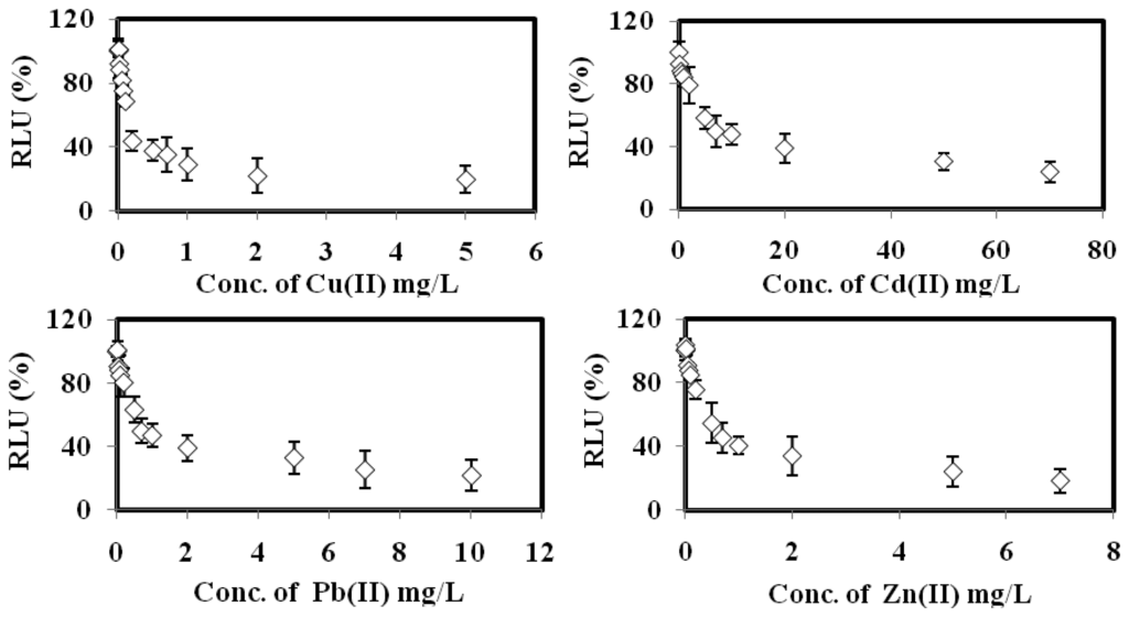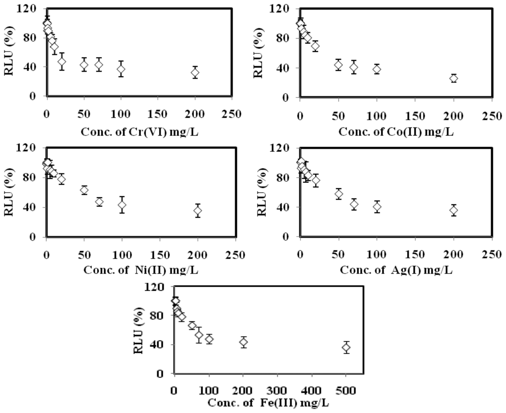 The bioluminescent sensor response towards the toxicities of Cu(II), Cd(II), Pb(II), Zn(II) Cr(VI), Co(II), Ni(II), Ag(I) and Fe(III), respectively, are displayed in Figure 5. The biosensor gave 100% RLU when it was free of toxicant. When the microbial toxicity biosensor exposed to the various concentrations of the respective heavy metals, the bacterial bioluminescent reaction was disrupted, and hence the bioluminescence signal was reduced with the increasing individual toxicant concentration [24,25].