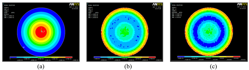 From the aforementioned description, the quality factor of the sensor should be improved as much as possible in order to increase the signal strength between the sensor and the external antenna. The number of inductor coils is predetermined as 15, and the width of the inductance coil is increased as much as possible, which can increase the inductance, reduce the resistance, and improve the quality factor of the sensor. According to small-deflection-plate theory, an increase in the thickness of the sensitive membrane and a decrease in the sensitive membrane area would contribute to an improvement in the loaded pressure range. Therefore, the parameters of the sensor, including the capacitance-plate radius, the height of the embedded cavity, and height of the sensitive membrane were improved, and the specific parameters of the sensor are listed in Table 1. By simulation using ANSYS software, the deflection, stress, and strain of the sensitive membrane under 60 bar are shown in Figure 2.