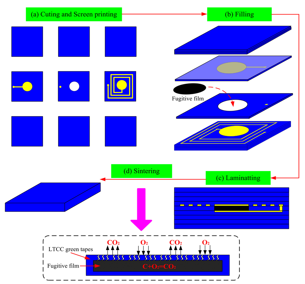 The sensor is fabricated by LTCC technology, and the fabrication process is illustrated in Figure 3. Dupont 951 green tapes are cut into 8-inch square green tapes, and nine-layer green tapes are prepared for sensor fabrication.