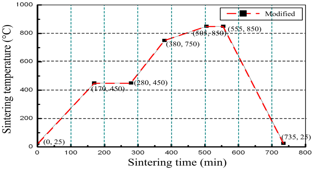 The final stack was placed into a box furnace for sintering for approximately 110 min at 450 °C, which was beneficial to bake off the organics. The fugitive film is volatile around 800 °C, and at the same time, the ceramic is in the porous state. Therefore, gas components can be excluded during the reaction. The heating rate at 800 °C (approximately 0.8 °C/min ramp rate) was reduced in the sintering process, which can make the fugitive film fully burn with oxygen. The highest sintering temperature was 850 °C, and the dwell time of the highest temperature was approximately 30 min. Finally, the ceramic substrate completed the solid-phase reaction, and the fugitive film burned completely to form a sealed cavity, as shown in Figure 3d. In the sintering process, the furnace temperature was strictly controlled, and the specific sintering temperature curve is illustrated in Figure 4. An image of the fabricated embedded wireless passive sensor is shown in Figure 5.