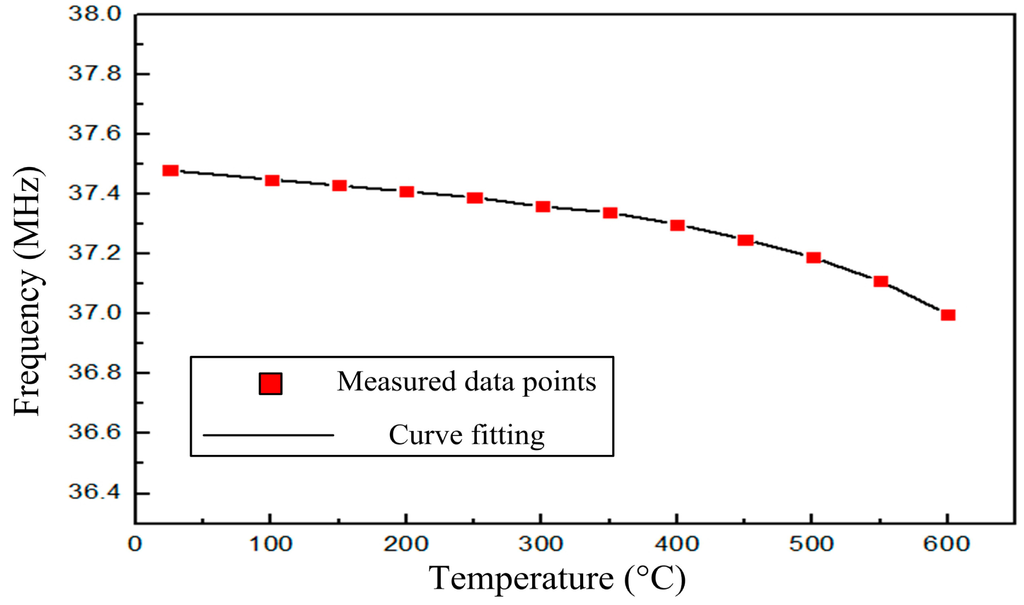 Figure 7 shows the resonance frequencies of the sensor measured at atmospheric pressure from room temperature to 600 °C, and the resonance frequency of the sensor exhibits a slight change as the temperature increases. From the high-temperature performance test, we can conclude that the sensor can obtain a frequency signal in a high-temperature environment, which verifies the stability and availability of the sensor in high-temperature environments. Further, the average slope of the sensor is approximately −0.75 kHz/°C from room temperature to 600 °C, which is smaller than the previous LTCC pressure sensor studied by Xiong in 2013 []. In addition, the smaller frequency drift in a high-temperature environment will be more conducive to reducing errors caused at high temperature and obtaining a real pressure signal in high-temperature pressure environments.
