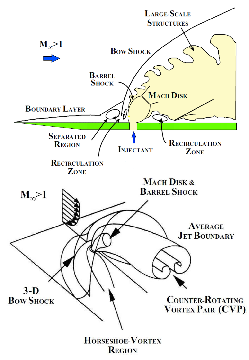 On the other hand several studies investigated mixing performance and penetration characteristics of transverse jets in high speed cross flows at relatively low supersonic Mach numbers in “cold” wind tunnels [7–9]. These studies provided valuable experimental data shedding light on the jet penetration and associated trajectories measured by Mie/Rayleigh scattering. Specifically, Ben-Yakar [10] investigated the convection and mixing characteristics of hydrogen and ethylene transverse jets at Mach 3.4 in an expansion tube with realistic upstream conditions for scramjet applications. Ultra high speed schlieren photography and Planar Laser Induced Fluorescence (PLIF) of OH radicals were utilised to obtain detailed information on the molecular mixing. The mechanism behind the mixing was found to be the promotion of small scale structures rather than global manipulations of the main stream since mixing leading to chemical reactions occurs at the molecular level. The near field mixing of transverse jets is dominated by so-called “entrainment-stretching-mixing process” [10], driven by large scale jet shear layer vortices as they are shown in Figure 1 (top figure). Due to the obstruction introduced by transverse jet, a bow shock forms and stands off from the injector orifice. In the region between the bow shock and the transverse jet, the injectant fluid moves with a higher velocity tangentially to the interface than the free stream fluid. As a result, large vortices are periodically formed engulfing large quantities of free stream fluid and drawing it into the jet shear layer (macro-mixing). These vortices are convected downstream at high speeds, where the injectant and air are then mixed by slow molecular diffusion. They stem from so-called Kelvin-Helmholtz instabilities [11]. In general, large scale structures are beneficial for the enhancement of bulk mixing, but they hinder fine scale or molecular mixing. However, they also stretch the interface between unmixed fluids. Stretching increases the interfacial area and simultaneously steepens the local concentration gradients along the entire surface while enhancing the diffusive micro mixing [10]. In terms of other coherent structures, horseshoe vortices formed by the upstream separated regions due to the adverse pressure gradient caused by the bow shock, wrap around the jet periphery and convect downstream as they are shown in Figure 1 (bottom figure). Counter rotating vortices develop on top of the normal shock (Mach disc) that is caused by sudden expansion of the jet stream. These counter rotating cross flow vortices are assessed by [12] as the primary source of entrainment of surrounding incoming flow air into jet flow that is important for farfield mixing. They are produced by folding of the vortex ring, which is the downstream manifestation of vorticity arising from the sidewall boundary layers of injectors [13]. Finally, wake vortices periodically shed near the base of the inner jet core and trail downstream under the jet plume [12,14].