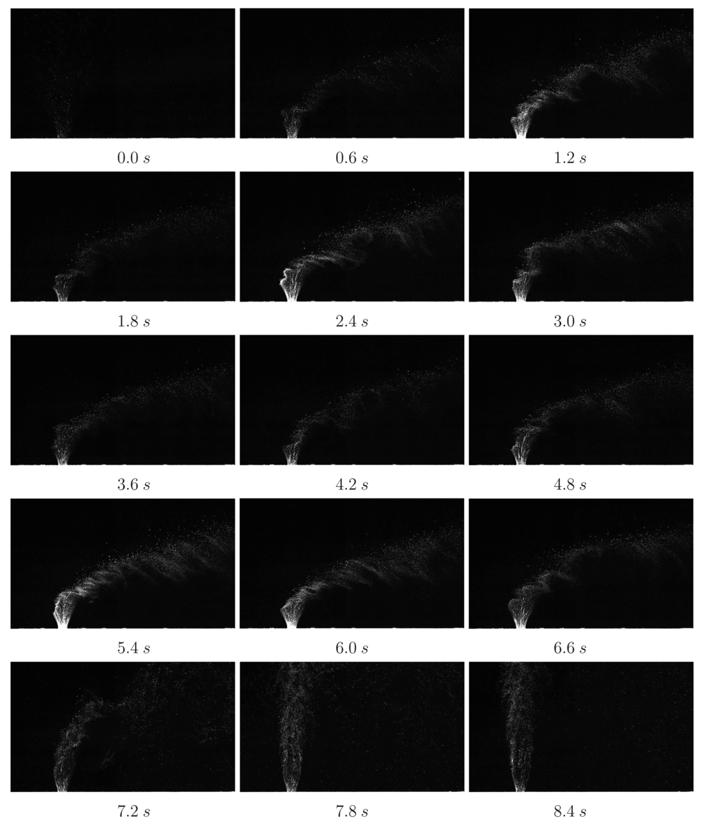 Figure 10 shows the raw PIV images captured throughout the test run for air jet. In the experimental test campaign the transverse jet is started just before the test gas arrival. In that time the jet discharges nearly vertically (minimum effect of the vacuum downstream) due to significant initial jet momentum flux ratio. Afterwards with the arrival of the freestream test gas, transverse jet bends towards the main direction of the freestream flow, in the horizontal direction, x. Unsteadiness of the jet trajectory and jet shear layer instabilities are observed clearly. Periodically formed large vortices engulf large quantities of incoming air, drawing it into the jet shear layer, and then are swept downstream. After the useful running time has passed (around 7.2 s), severe oscillations start to occur in the jet flow as Mach 5 flow no longer exists and finally when the firing valve is closed (when there is no cross flow) the jet discharges nearly vertically. The early termination of useful running time (7.2 s instead of 7.5 s) is attributed to the fact that a constant mass flow rate of the secondary jet is increasing the mass flow rate going inside the vacuum tanks, and hence increasing the back pressure.