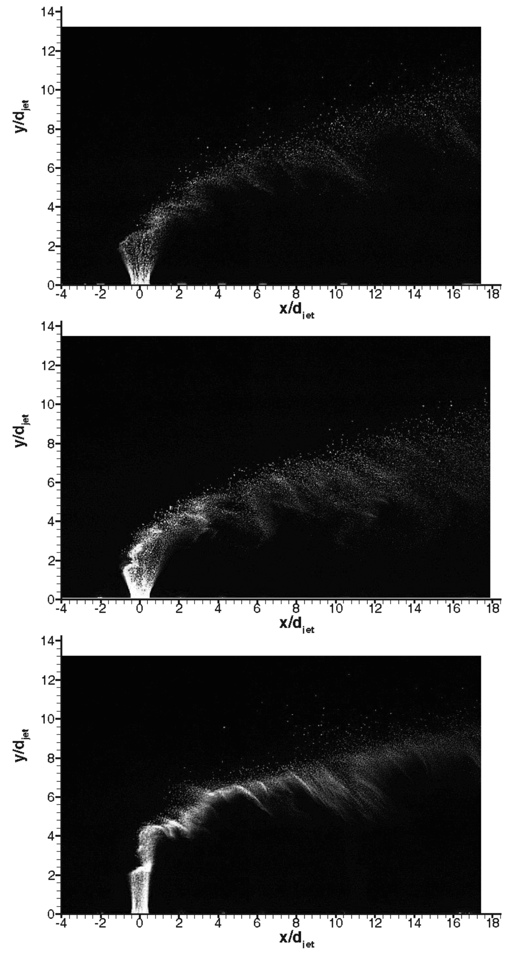 As suggested by Samimy and Lele [23], the particle dynamic effects may be further quantified by the Stokes number, Sk, written in Equation (4). For accurate flow tracking the time scale of the flow has to be greater than the time response of the particles, i.e., Sk ≪ 1. The characteristic jet flow time scale of can be found by assuming ΔV as Ujet and δ (shear layer thickness) as djet (see Equation (4)), whereas the particle time response can be calculated using sonic jet conditions for air, CO2 and Helium gases (T0jet = 295 K, Ujet = 315, 250, 875 m/s respectively). The respective timescales and Stokes numbers are tabulated in Table 1. The flow following capability of aluminum oxide particles for Helium injection is the most critical one (with a Sk of 0.14) due to highest jet velocity and biggest particle relaxation time; whereas for air and CO2, Sk ≪ 1 condition is clearly satisfied.