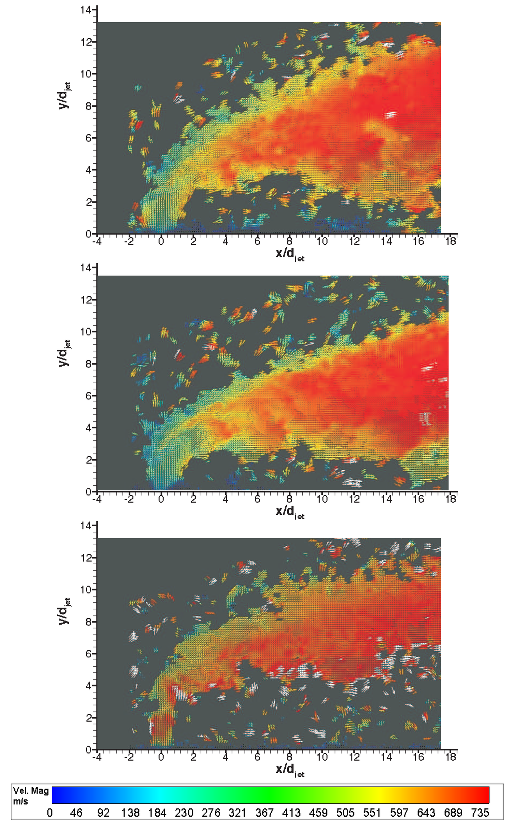 Figure 11 shows instantaneous raw PIV images with different gases in Mach 5 cross flow signifying the difference in penetration characteristics. The penetration trajectory is clearly affected by type of the gas in both nearfield and farfield. In the nearfield air and CO2 (despite being heavier than air) jets behaves similar in terms of initial expansion of the jet, however Helium jet expands little, discharges on vertical direction for about 3 jet diameters and then bends towards the main stream. This is believed to be because of high jet velocity and hence high convective Mach number. In terms of farfield structure Helium spreads minimal compared to others whereas CO2 jet convects closer to wall compared to air jet. Figure 12 shows corresponding velocity vector fields of the raw PIV images with different gases. The velocity vectors are coloured by velocity magnitude, i.e.,, where u and υ are stream wise and transverse velocity components respectively. White regions specify velocities above 750 m/s. The main flow is in the x direction and the jet orifice is located at the origin. The horizontal and vertical coordinates are normalized with the jet diameter, djet. The time that elapses between consecutive recordings of 15 Hz is significantly larger than the jet flow characteristic time scale is between 25–88 μs, leading to the measurement of uncorrelated velocity fields. With the current spatial resolution (two adjacent velocity vectors are separated by approximately 0.2 mm) it is inherently implied that global dynamics of the jet crossflow interaction is deduced. As the jet is discharged from the orifice, at a velocity around 315 m/s and 250 m/s for air and CO2 jet respectively, acceleration of the flow in the transverse direction is observed and terminated by the Mach disc which bends the jet towards cross flow. After the normal shock, the jet velocity is reduced followed by an acceleration reaching values of 750 m/s, which is close to the free stream velocity but slightly lower due to the presence of the bow shock. On the other hand Helium jet experiences deceleration after exiting the jet orifice and bends towards direction of the crossing stream sharply.