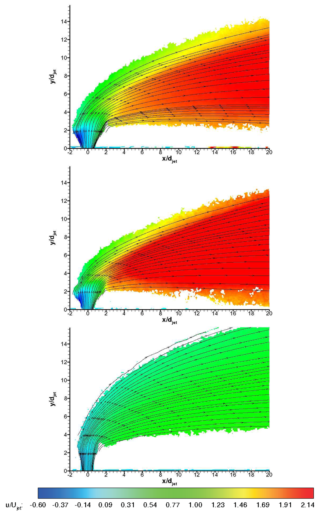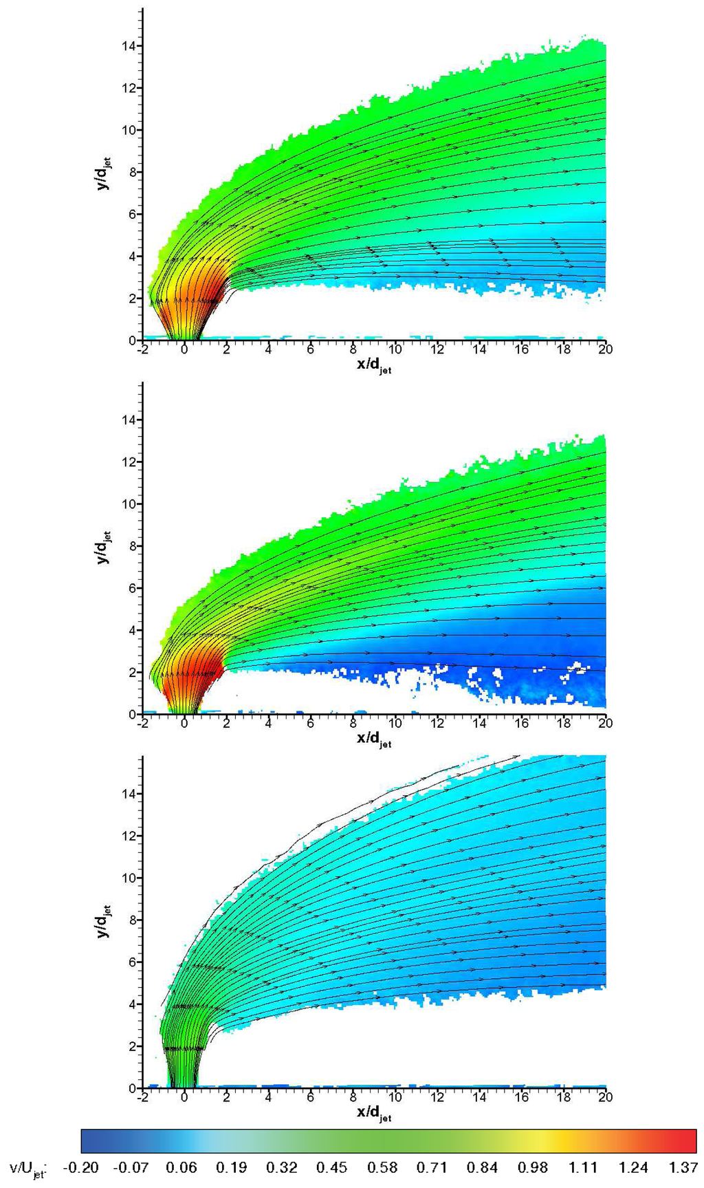Figures 13 and 14 show non-dimensionalised streamwise and transverse velocity contours, i.e.,u/Ujet and υ/Ujet, for three gases ensemble-averaged over 100 instantaneous vector fields during the useful running time of HSST Pathlines are also visualised. The unsteady jet shear layer structures do not appear in averaged velocity contours naturally. Leaving the jet orifice, the transverse jet expands depending on the back pressure behind the jet induced bow shock. On the windward side (upstream side), the jet turns quickly towards the main flow direction, whereas on the leeward side (downstream side) turning behaviour is more gradual. On the leeward side the termination of the jet expansion (Mach disc) is especially apparent for air and CO2 jets. Negative streamwise velocities are observed on the windward side of the jet stream in Figure 13, whereas negative transverse velocities are observed in the farfield on the bottom region in Figure 14. Air jet shows medium penetration path and expands substantially in farfield, whereas CO2 jet convects closer to the wall after a tight turn to main flow direction. On the other hand Helium jet bends abruptly after considerable vertical penetration and convects far from the wall. All of the jets reach nearly values below freestream velocity at the downstream regions, i.e., after x/djet of 8 (for Helium jet there is deceleration to main flow velocity) where they are carried by the main flow behind the jet induced bow shock wave. Penetration behaviour is clearly different with different injectant gases, which is in line with the findings in the literature [10,15]. Due to the low levels of seeding outside the jet boundaries the data is likely to include some level of bias towards to the velocity values in the regions with sufficient seeding density. This velocity bias is most likely to tend to approach to the transverse velocity component in the jet nearfield whereas in the farfield it is expected to tend to approach towards the streamwise velocity component. Therefore the data outside the pathlines is questionable in absolute terms. The uncertainty in the ensemble-averaged mean velocities based on jet velocity is tabulated in Table 4, using an approach from Humble [29].