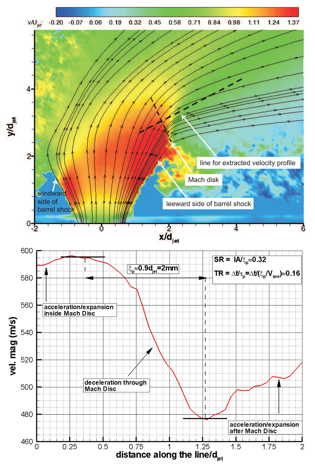 For a PIV experiment, the conditions for SR, TR ≤ 1 can be considered acceptable for an accurate measurement of the tracer response time [31]. This condition has implications on the required seeding concentration and digital imaging resolution as well as on the time separation between exposures. In the current experimental campaign, the SR and TR values are found after measuring ξp and τp values from the ensemble-averaged flow field for air jet through Mach disc. As there is significant deceleration through the Mach disc, particles cannot adjust themselves as quickly as the jet flow, which causes blurring. In addition the unsteady shock motion in the Mach disc also causes blurring for each instantaneous velocity vector field. When instantaneous vector fields are ensemble-averaged to obtain an averaged flow field, a combined effect of blurring is exhibited around the Mach disc. To find the experimental relaxation distance and response time of the particles, a velocity profile normal to Mach disc is extracted for air jet and plotted in Figure 15. ξp and τp values are found to be 2.0 mm and 3.7 μs respectively and the criteria of SR, TR ≤ 1 for the assessment of particle response behaviour are satisfied.