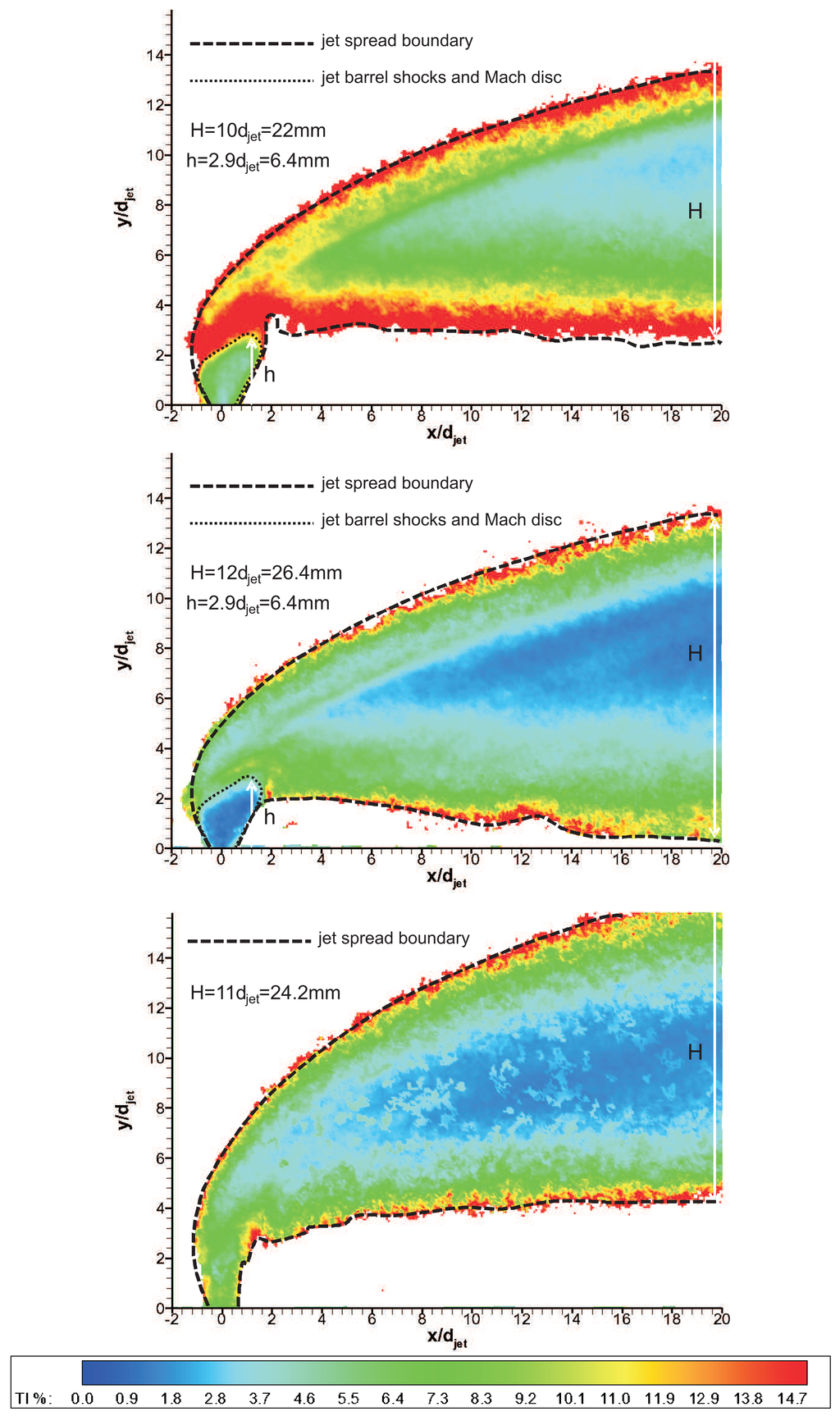 Figure 16 shows the sum of RMS of streamwise and transverse fluctuations ( , i.e., turbulence intensity, TI) contours over 100 instantaneous vector fields for three gases during the useful running time of HSST. These results reflect the interaction that takes place within the flowfield between the jet with the freestream flow and the distributed nature of the turbulence. Standard deviation images produce information regarding the large-scale mixing/entrainment and reveal the mixing zones [9]. Therefore the jet boundaries and the associated penetration characteristics can be demonstrated using RMS contours. The barrel shocks and Mach disc forming the initial jet boundary could be clearly seen and were visualised/quantified for the first time in literature using PIV by [21]. The upper boundary of the jet spreading is defined by the maximum penetration of the shear layer vortices. On the other hand the lower boundary of the jet spreading is defined by the jet stream above the wake vortices that are mentioned in Section 1. Therefore the penetration bandwidth, H, can be related to the difference between the extents of the jet boundary. The biggest penetration band is observed for CO2 jet at 20 jet diameters downstream, on the other hand Helium jet expands significantly at downstream locations. Maximum turbulence occurred above the Mach disc due to the presence of the shear layer and at the intersection of the windward side of the barrel shock and bow shock. Substantial increase in TI occurs outside jet spreading boundaries, leading to non-physical turbulence information (an artefact of PIV image correlation in the absence of necessary particle population). Therefore a TI threshold value is applied to discard these regions, which is taken as 20%.