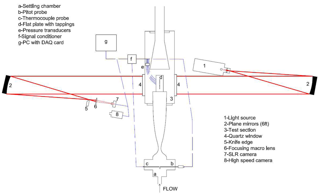 Toepler's z-type schlieren technique, adopted for flow visualisation, consists of a continuous light source of Palflash 501 (Pulse Photonics) with a focusing lens and a 1 mm wide slit, two 203.2 mm parabolic mirrors with 1828.8 mm focal length, a knife edge, a set of Hoya 49 mm close-up lenses and a digital Canon SLR camera, EOS-450D, 12MP A parallel beam of light is passed through the test section windows before focusing on the knife edge plane that is placed perpendicular to flow direction and the focused beam is shone on the CMOS sensor of the camera [19]. The camera is set to continuous recording mode at 3.5 fps with full resolution; the shutter speed is adjusted to maximum value of 1/4000 s with an ISO speed of 400 to provide enough detail and appropriate brightness. The digital resolution is approximately 34 pixels per mm. In addition a high speed Photron SA-1 High Speed Video system is utilised to record time-resolved Schlieren images up to 675,000 fps at various pixel resolutions and shutter speeds. The optimum frame rate is based on a compromise between adequate temporal resolution and pixel resolution. The shutter speed is set to 1 μs to resolve flow features with sharpness. The digital resolution is approximately 10 pixels per mm. The layout of the optical setup and the data acquisition architecture with measurement chain is shown in Figure 3.
