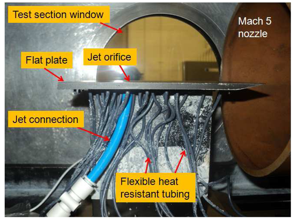 The model used for this study is a sharp leading edged flat plate (leading edge thickness smaller than 100 μm) with a converging circular jet orifice of 2.2 mm in diameter, through which a sonic turbulent jet of air, CO2 and Helium jets are injected after regulation. The flat plate is 155 mm long, 68 mm wide and 5 mm thick and painted matt black to avoid reflections for PIV application. The jet orifice is located at 105 mm from the leading edge at the centreline. The jet stagnation pressure, p0jet, is adjusted with the help of a pressure transducer, Kulite XTE-190M (3.5bar range) that is connected to an 8 mm air pipe via T-junction. The model, situated inside the test section, is shown in Figure 4.
