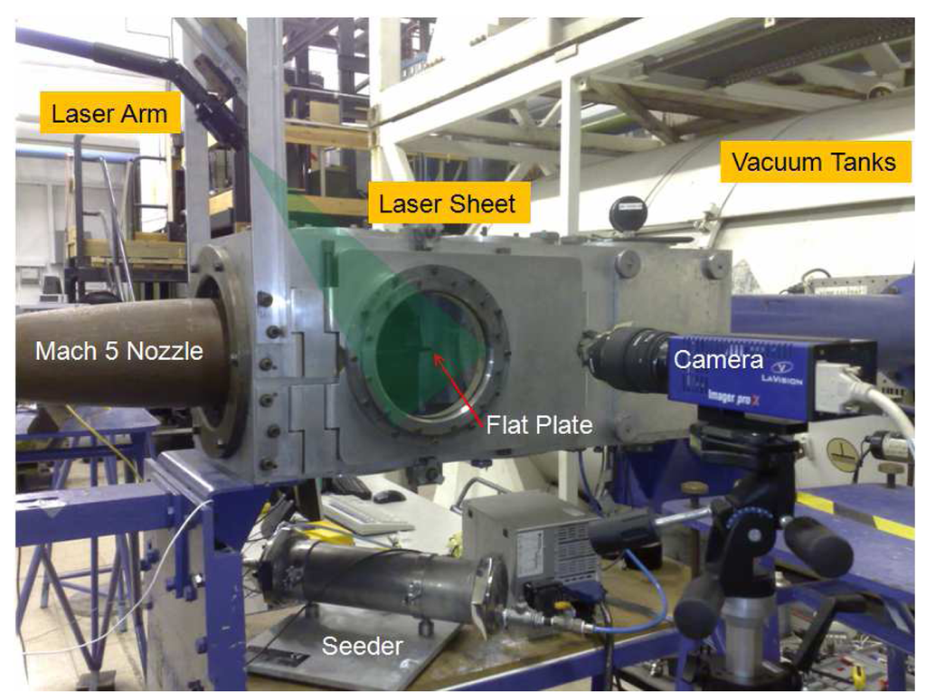 - Haertig, J.; Havermann, M.; Rey, C. Particle image velocimetry in Mach 3.5 and 4.5 shock-tunnel flows. AIAA J. 2002, 40, 1056–1070. [Google Scholar]