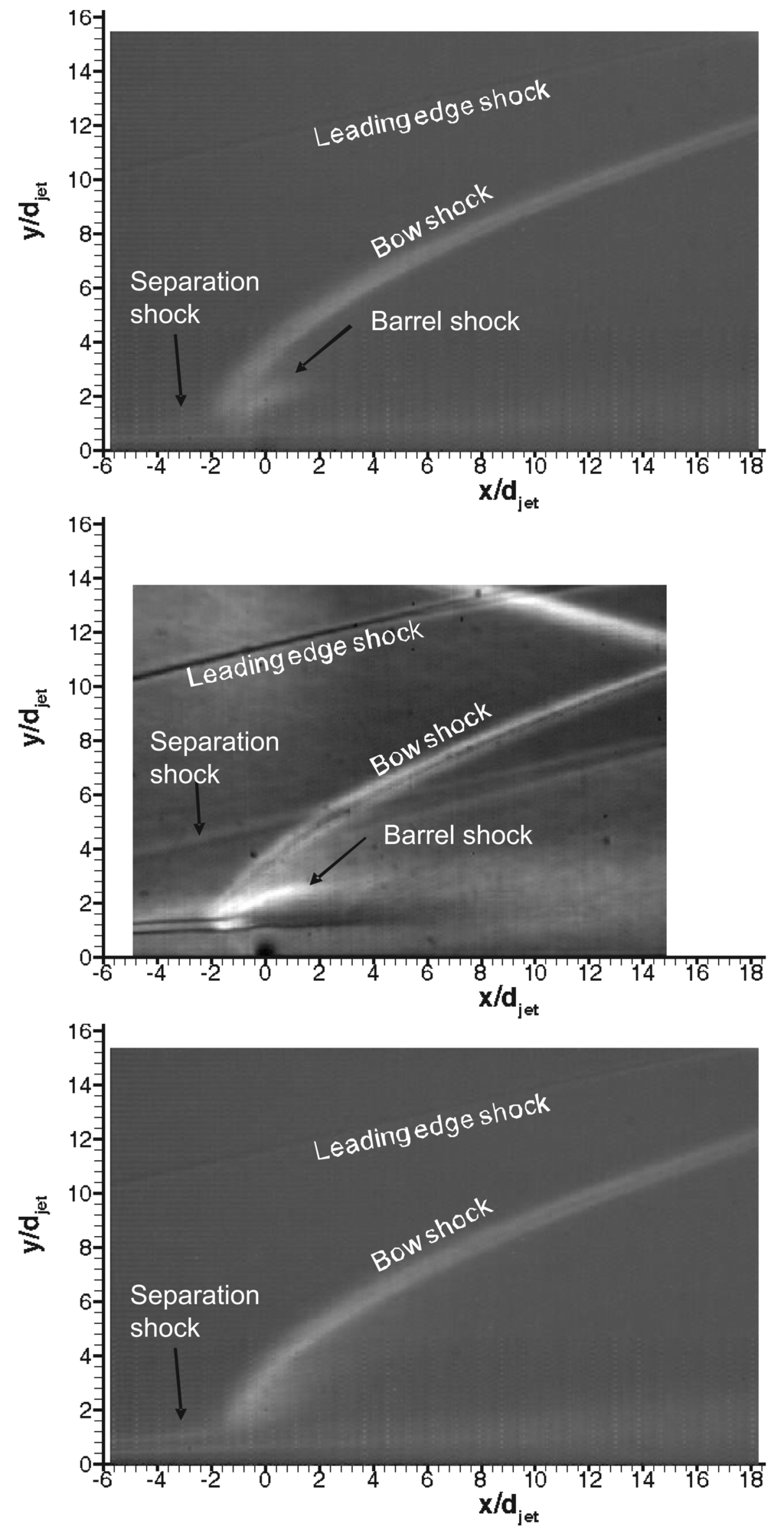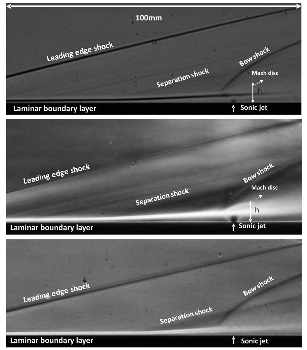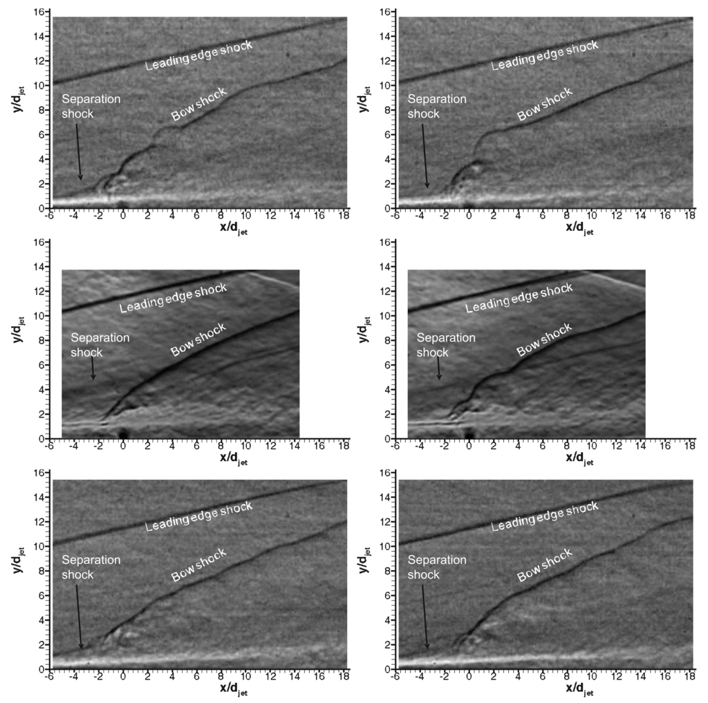Figure 7 shows the long exposure (250 μs) schlieren images of the flowfield for all the gases as shown in Table 2. A leading edge shock due to viscous interaction at the leading edge of the plate and a laminar boundary layer growing up to the separation point and then deviating towards vertical direction thereafter can be observed clearly. The high speed boundary layer developing on the flat plate before the jet induced separation within the achievable range of unit Reynolds numbers, is laminar unless tripped [19]. Whereas the jet flow is turbulent for the range of Reynolds numbers (see Table 2). Due to the separation of the incoming laminar boundary layer, transition to turbulence is likely to occur within the upstream separation regions. The cause of this phenomenon is the extreme sensitivity of the separated shear layer to disturbances [26]. Separation shock emanates around the separation point and intersects the jet induced bow shock; the sonic jet expands suddenly and bends downstream, afterwards its expansion is terminated by the Mach disc. The maximum vertical position of the Mach disc is taken as the Mach disc height, h. The nearfield boundary of the jet is confined within the barrel shocks. The separation region, separation shock and bow shock are three dimensional curved flow structures around the transverse jet. These three dimensional flow structures are superimposed on schlieren images and are well reported in the literature and mentioned in Section 1. The separation region is clearly different for different gases; CO2 jet produces a bigger separation region and Helium jet has the smallest region. This phenomenon can be interpreted as an effect of the molecular weight based on high sonic velocity at the jet orifice (about 875 m/s for Helium compared to 315 m/s for air at Mach 1). Higher jet velocities usually translate into high convective Mach numbers, which imply reduced mixing [27]. This phenomenon may cause reduced blockage of the jet flow. In terms of bow shock position all the jets have similar bow shock pattern suggesting similar penetration structure.