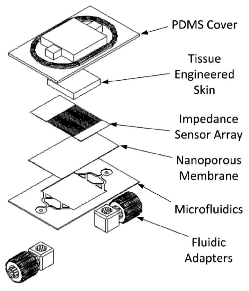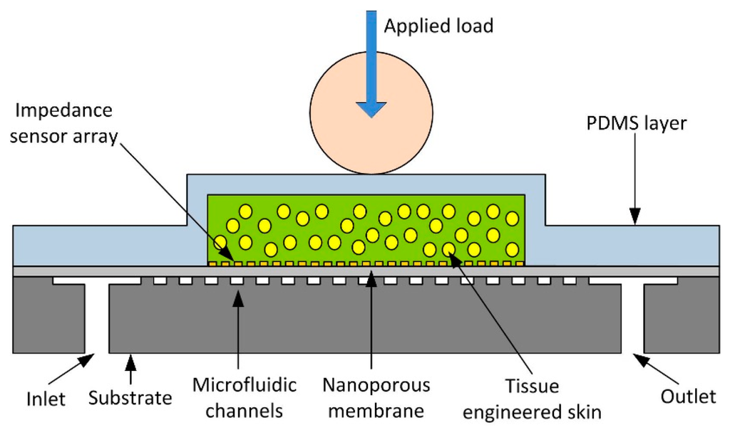 The device consists of a system of microfluidic microchannels etched into a silicon substrate designed to supply the skin analogue with nutrients and maintain its long-term viability. The channels lead into a chamber with a regular array of 50 μm diameter micropillars that allow flow whilst supporting a polycarbonate nanoporous membrane. The membrane is 30 μm thick with an irregular array of 200 nm diameter through-thickness holes etched. On the membrane is an impedance sensor array consisting of ten parallel electrodes, each pair forming an impedance sensor, shielded with ground lines. The membrane with electrodes forms a layer upon on which the skin analogue is supported while allowing nutrient media to diffuse through to the cells. The cells were cultured and encapsulated in alginate, a hydrogel with mechanical properties comparable to the dermal layer of skin. The microfluidic channels are sealed and the cells are confined to a well using a poly(dimethylsiloxane) (PDMS) cover plate. The PDMS effectively becomes the epidermis layer providing a robust surface to conduct experiments whilst transmitting stresses and protecting the encapsulated skin analogue. The PDMS also serves as a seal containing any excess fluid. A cross-section of the assembled system is shown in Figure 2.