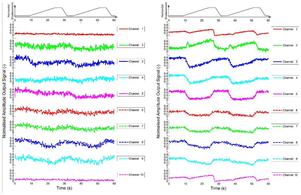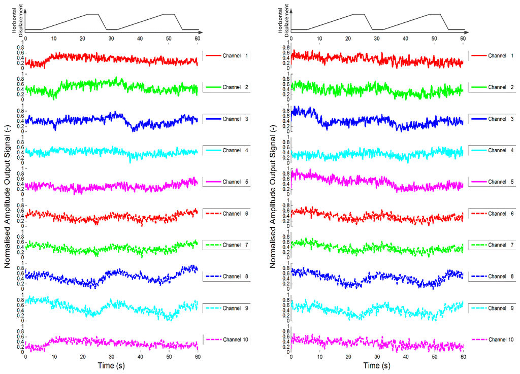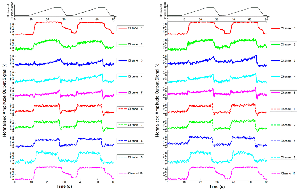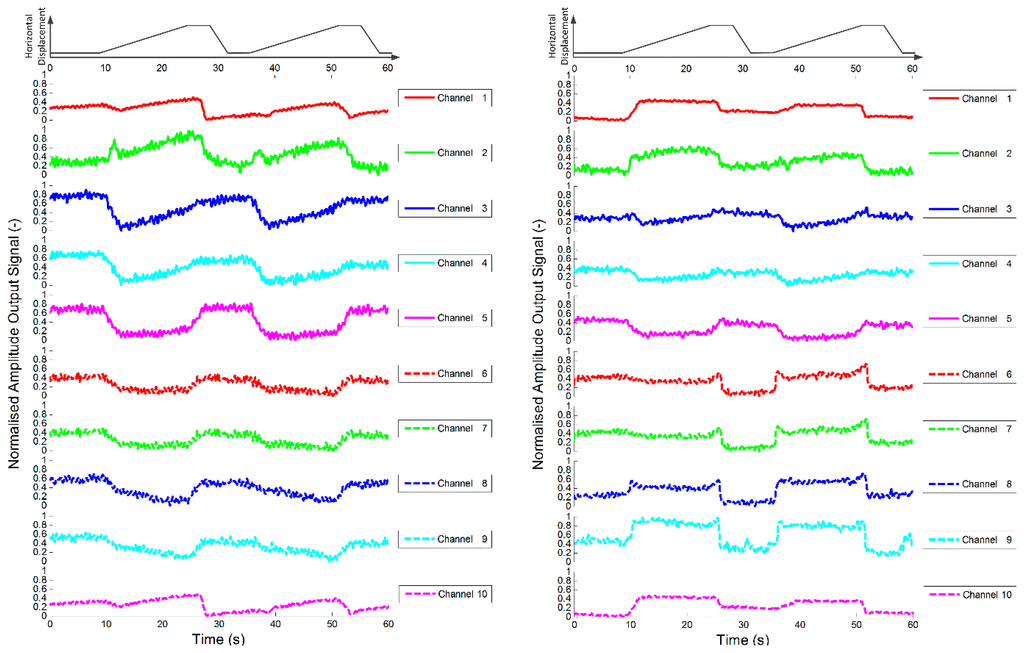 As a control study, the sensor was first loaded with a cellular tissue, i.e., pure alginate gel. Two data sets are shown in Figure 10 that demonstrate the response of each sensor channel as the stimuli is slid across the sensor surface twice in a manner described in Section 3.1.