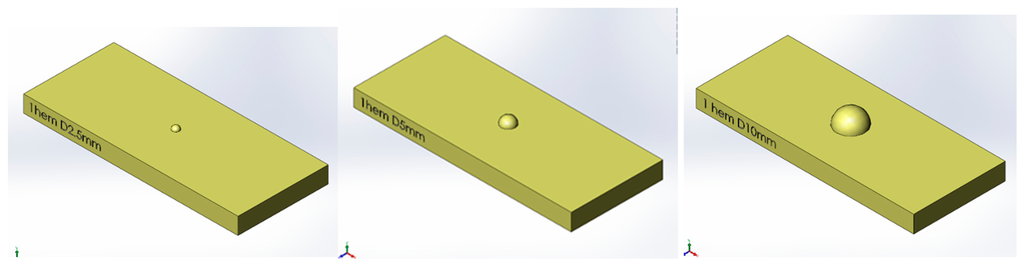 Finally, the same protocol was applied to stimuli of different shape and dimension. The new stimuli are three different diameter hemispheres; the spherical shape should avoid any eventual border effect. Figure 12 shows the three stimuli. We underline that, in the case of hemisphere, the height is different among the stimuli because it depends on the radius.