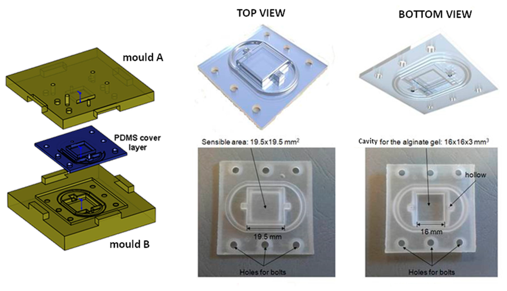 The PDMS cover layer was designed to house the skin analogue, forming a watertight seal around the entire microfluidic system. PDMS is elastic, soft and gas permeable, thus allowing the respiration of cells. In addition to being a basic seal, it is also tough and durable and therefore it had a role similar to the epidermis layer on human skin. It was fabricated by mixing a two-part solution in a 10:1 ratio (Sylgard 184, Dow Corning, Midland, MI, USA) and pouring it into a mould fabricated using a 3D printer. The mould was compressed and the PDMS was polymerized in an oven at 80 °C for 4 h (see Figure 4).