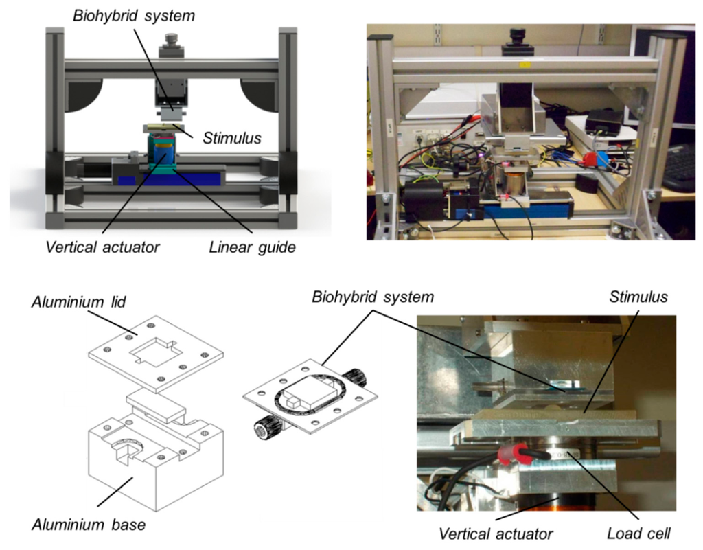 In order to test the bio-hybrid system, a custom aluminium element was designed to connect the sensor to the top of the dynamic platform. In this way, the bio-hybrid system takes the place of the finger in the human touch studies mentioned earlier. The stimuli were attached to the lower part of the dynamic platform, above the actuator, in order to be moved vertically along the indentation axis and translated horizontally along the tangential direction. The experimental procedure was designed so that the bio-hybrid sensor received stimulation profiles comparable to those that are applied to the human finger during ongoing electrophysiological and psychophysical passive-touch studies. During such experiments the sensor was interfaced to the readout electronics (transimpedance amplifier, described in Section 2.1.2) in order to record impedance data.