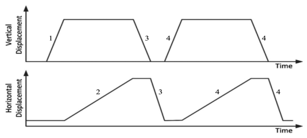 The experimental protocol consisted in sliding experiments, inspired to psychophysical protocols reported in the literature [35]. The sliding protocol (Figure 8) consisted in an initial normal indentation and a tangential sliding motion. The large indentation depth was to ensure a significant change in impedance in this preliminary experimental evaluation, whereas the slow ramp time was to ensure the transient change in impedance was observable (phase 1 in Figure 8). The stimulus was displaced at constant velocity across the active sensing area (phase 2 in Figure 8). Then the stimulus was retracted and repositioned (phase 3 in Figure 8) and the experiment repeated (phase 4 in Figure 8).