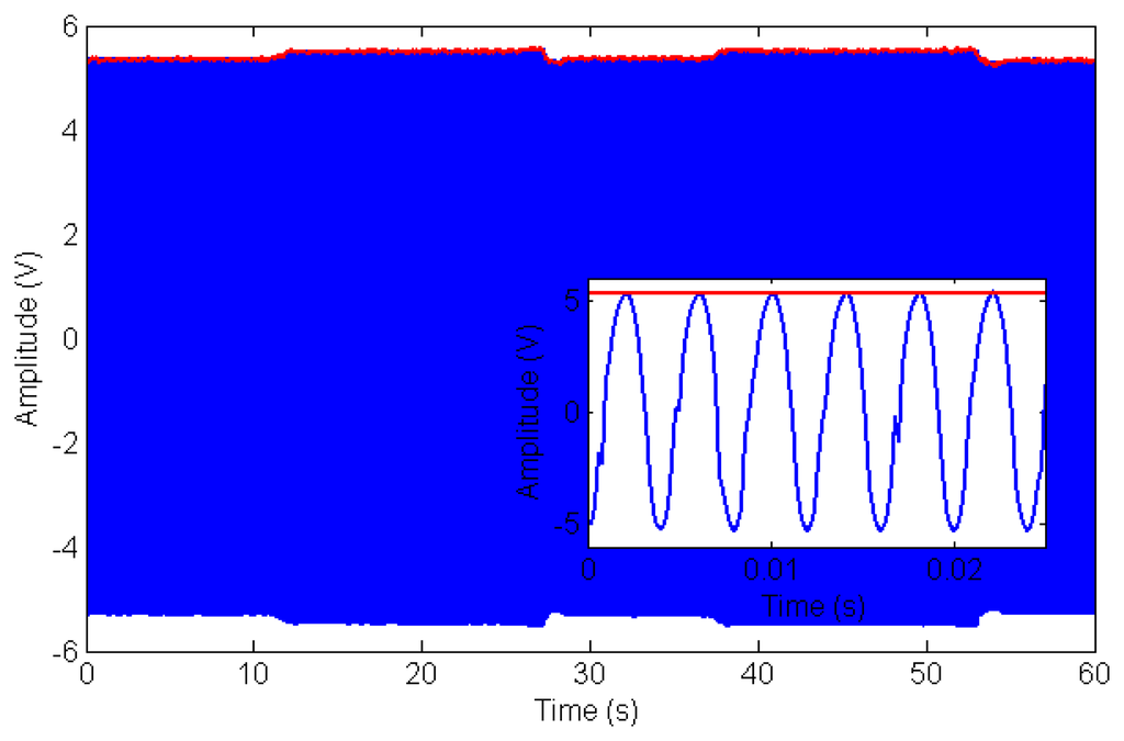 The red line indicates the amplitude as calculated using FFT to extract the amplitude modulation over the 250 Hz sinusoidal driving signal (see Figure 3 for the conditioning circuitry). A window size of 0.1 s and a transform length of 4096 points was used in the Fast Fourier Transform algorithm [36]. Given a sampling frequency of 5000 Hz and a drive frequency of 250 Hz, this means the impedance data was averaged over 25 time periods with 20 samples per period. Considering the input-output characteristics (−10 kΩ gain) of the transimpedance amplifier, 1 V output voltage amplitude corresponded to −0.1 mA input current.