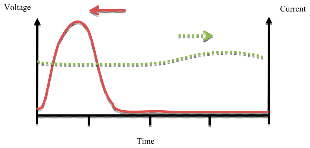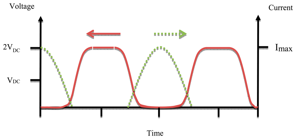 The voltage and current waveforms of Class F amplifiers are shown in Figure 6, where the voltage is like a square wave due to the odd harmonics of the fundamental frequency. Current is like a half sine wave that has a phase degree of π [19]. Class F amplifiers are supposed to have a theoretical efficiency of 100%, but the resonant circuit become difficult to design for higher than 5th harmonics [20].