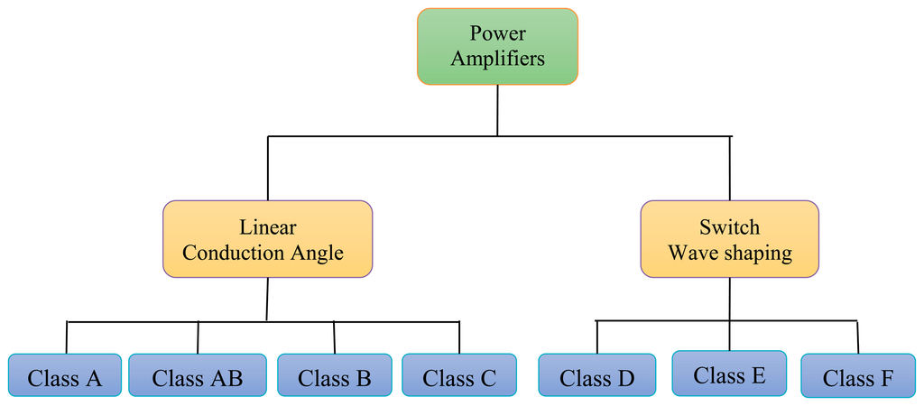 In transcutaneous power amplification systems different classes of power amplifiers (PAs) such A, AB, B, C, D, E, and F are used for the biomedical frequency bands. Output power ranges from a few mW to several Watts, depending on the applications. The bias applied to a power transistor determines the type of amplifier class [11]. The level of performance of a PA can be evaluated by choosing its bias point. From the PA bias, efficiency, linearity, or other parameters can be evaluated. The power amplifiers are divided into two main types, according to the operating mode [12] as shown in Figure 3. The first type is conduction angle or linear PA, if the PA transistor works as a converter of the RF input signal into a current. The second type is a switching PA, if the PA operates as a switch.