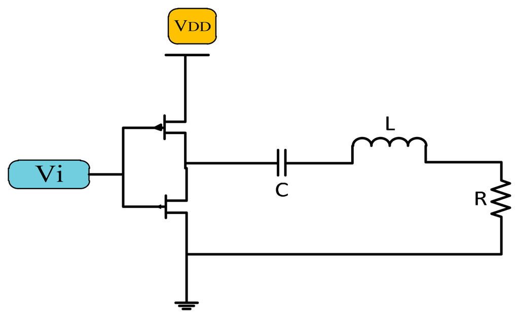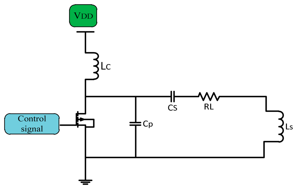 In implanted device transcutaneous systems Class E PAs are broadly used. They have a high efficiency near 90%, simple architecture, higher power transfer, no mixer is used if used as a modulator which make them better as power drivers for transmitter coils [23,24]. The simple Class E PA consists of a CMOS transistor as a switch, and a shunt capacitor (C) used for soft switching in non-ideal CMOS, so there is no overlap between voltage and current. A choke inductor (LC) used to keep supplied current (IDC) constant DC flows through the amplifier. The shunt capacitor CP connected in parallel with the series load network of the transistor is adjusted to a known frequency to fix the current of the supply source and convert the digital input into a sinusoidal output with zero DC [25]. Figure 9 shows a simple Class E power amplifier.