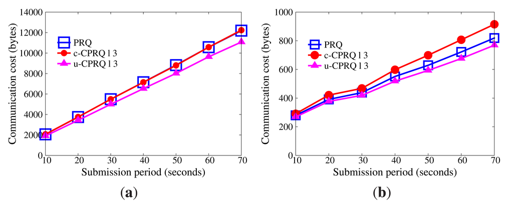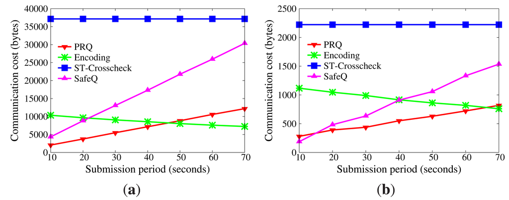 Figure 6 demonstrates the impact of submission period on communication cost without node collusion (the network size is 400). The submission period is defined as the interval time between two successive submissions. It is observed that the submission period has no effect on the communication cost of the sensor node in ST-crosscheck, because it is only related to the number of neighbors and the number of buckets. Due to the reduction of empty buckets, the communication cost of sensor nodes in Encoding decreases as the submission period increases, which is opposite to what occurs in PRQ and SafeQ. When the submission period is below 40 s, the communication cost of sensor nodes in PRQ is less than the others. When the submission period continues growing, the communication cost of sensor nodes in PRQ increases slowly. Each datum d in SafeQ needs to attach (⌊log2 d⌋ + 1) prefix-membership codes, whereas only one compressed BFcode is appended in our PRQ.