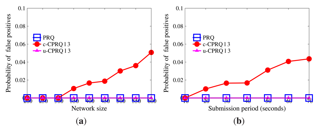 Given a range query, the definition of the probability of false positives is the same as that in Section 9.1.2. Figure 11 indicates the probability of false positives. It can be seen that the probability of false positives in both u-CPRQ and PRQ is 0%, while that in c-CPRQ increases with the growth of the network size and submission period. The reason is that the relaxed membership test in c-CPRQ brings in false positives, and there are no false positives generated in PRQ and u-CPRQ based on the precise bounds. However, u-CPRQ and c-CPRQ can resist collusion attacks, while PRQ cannot. c-CPRQ is also acceptable for users if the probability of false positives in c-CPRQ is small enough.