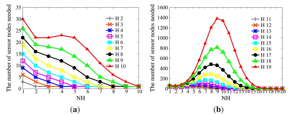 If there are sufficient collusive sensor nodes, H will be inferred based on NH. The expectation of the number of sensor nodes needed to infer H is provided in Figure 12. When |H| is large enough, it becomes a bell curve, whose axis of symmetry is the line |NH| = |H|/2. Thus, |NH| should be selected from the left side of the axis of symmetry in order to control the size of the compressed BFcode. To guarantee the availability of WSNs, the number of collusive sensor nodes should be limited. For example, the size of the network is 1000, and at most, 10% of sensor nodes will be compromised. Given |H| = 20, if |NH| = 4, at least 179 sensor nodes are needed, while if |NH| = 10, at least 2397 sensor nodes are needed. Due to the limited attack ability, it is impossible for adversaries to compromise so many sensor nodes. Therefore, the series of CPRQ can prevent collusion attacks.