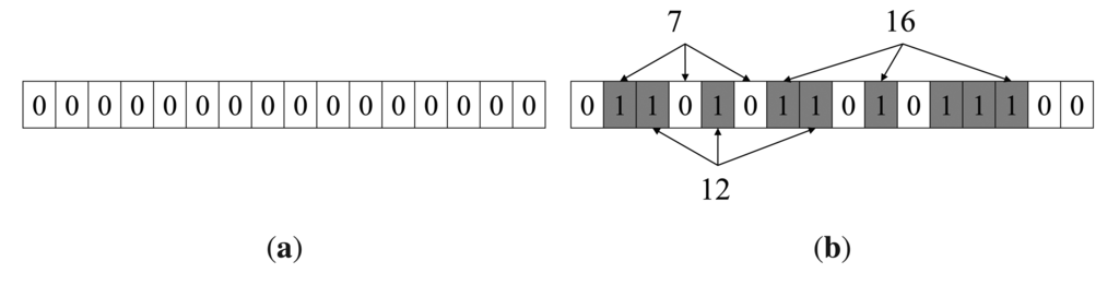 Assume that a Bloom filter consists of two parts: an array of m bits initialized to 0 and k independent one-way hash functions hi, …,hk mapping elements in the universe to a random number uniformly over the range {1, 2, …,m}. Given a set S = {xi|1 ≤ i ≤ n}, add an element x into S, just by setting all hj(x)-th (1 ≤ j ≤ k) bits to 1. Thus, the Bloom filter of S is constructed by setting all hj(xi)-th (1 ≤ i ≤ n, 1 ≤ j ≤ k) bits to 1. To examine if an element y is in S, check whether all of the hj(y)-th (1 ≤ j ≤ k) bits are set to 1. If not, y is definitely not in S. Otherwise, y may be in S. Either y is really in S or the k bits have been set to 1 by chance during the insertion of other elements in S, which is called a false positive. Figure 2 is an example of the Bloom filter. 0110101101011100 is the Bloom filter of the set S = {11,12,13,14,15}. Examine if S contains 7, 12 and 16, which are hashed to bits (2, 4, 6), ⟨3, 5, 8⟩ and ⟨7,10,14⟩, respectively. It is found that 7 is definitely not in S; 12 and 16 are considered to be in S, although 16 is actually not in S.