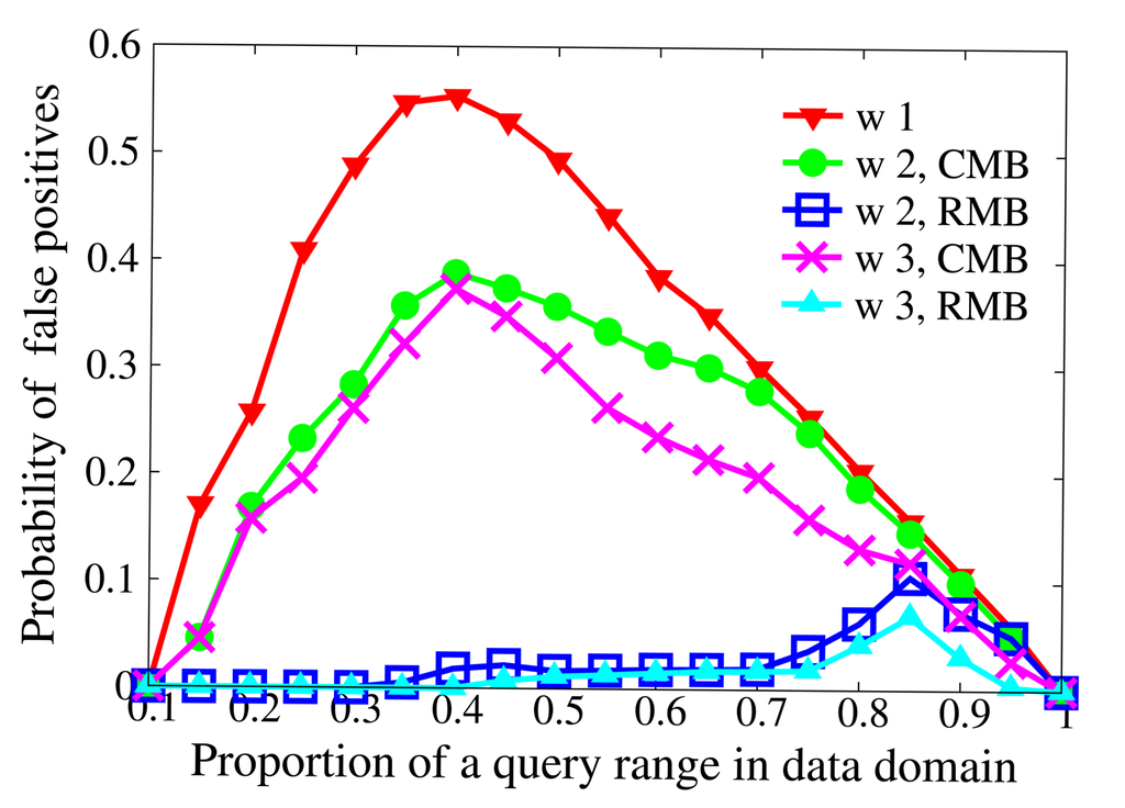 Figure 4 demonstrates the impact of multiple BFcodes on false positives. In this experiment, the size of a BFcode is 128 bits. The data domain is [0, 1000]. We randomly choose 10 ranges in the data domain for each proportion of a query range and take the average probability of false positives. w (w = 1,2, 3) denotes the number of BFcodes for queries. Consecutive multiple BFcodes (CMB) and random multiple BFcodes (RMB) are the proposed partition schemes of a query range.