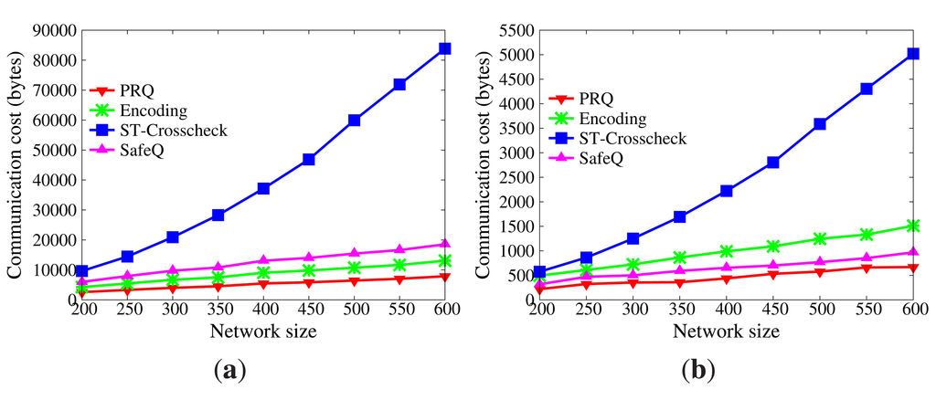 In WSNs, communication is the dominant factor of energy consumption. The lower the communication cost, the better the efficiency Figure 5 displays the impact of network size on communication cost without collusion attacks (the submission period is 30 s). As the size of the network grows, more data are transmitted from sensor nodes to master nodes, and more data stored in master nodes satisfy the query range. Therefore, communication cost increases. Besides, the communication cost of sensor nodes goes far beyond that of master nodes, because master nodes only submit satisfactory data. It is evident that the communication cost of sensor nodes in PRQ is much less than that of other protocols. In ST-crosscheck, each bucket of sensor nodes attaches the bucket information of all neighbors, and its communication cost of sensor nodes is related to the product of the number of their neighbors and the square of the bucket number. In Encoding, the more the empty buckets, the more the attached codes. SafeQ constructs a prefix family for data as the attached code. Given the data d, their prefix family needs (⌊log2 d⌋ + 1)2 bits. However, PRQ just appends a compressed BFcode to the data.