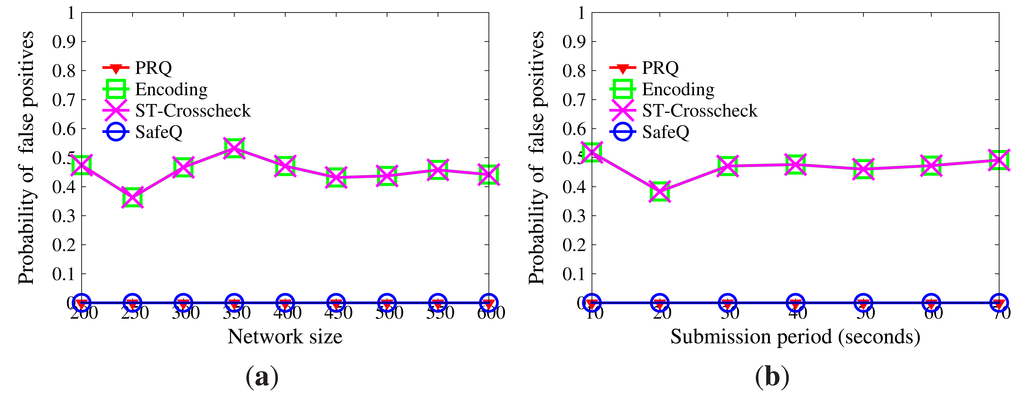 Figure 7 reveals how the probability of false positives is influenced by network size and submission period. The result of SafeQ is accurate, and there are no false positives. Encoding and ST-crosscheck are built on the bucketing technique, which has a great effect on accuracy. The more the buckets, the fewer the false positives, but the weaker the privacy. On account of multiple BFcodes, PRQ achieves accurate results, as SafeQ does. Besides, the network size and submission period have no impact on the probability of false positives.