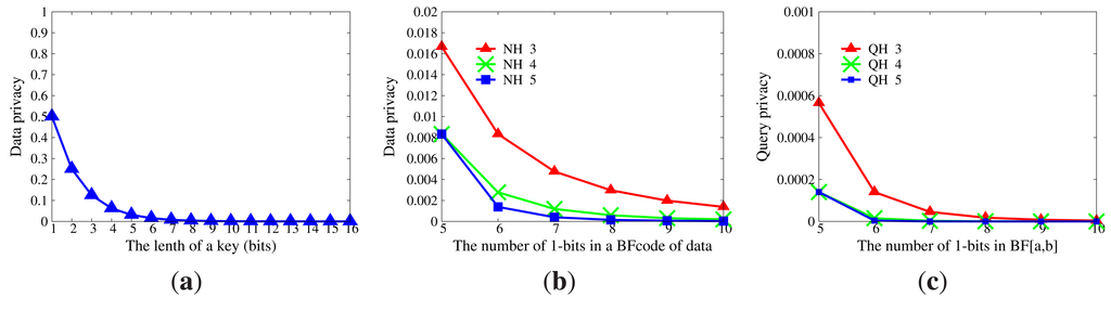 Data privacy will be disclosed if master nodes acquire either the correct key or the correct hash functions NH for data encoding, as mentioned in Section 8.2.1. The privacy of data is shown in Figure 8a,b. The probability that master nodes can decrypt data correctly is extremely tiny if the length of a key is large than 8 bits. The probability that master nodes can guess actual data upon their BFcodes and right hash functions NH is less than 0.01 when |NH| ≥ 4. Figure 8c displays the privacy intensity of queries. For a certain range [a, b], it is obvious that the probability that [a, b] is deduced from the BF[a,b] can be neglected, even though the set of hash functions QH for query encoding is reachable.
