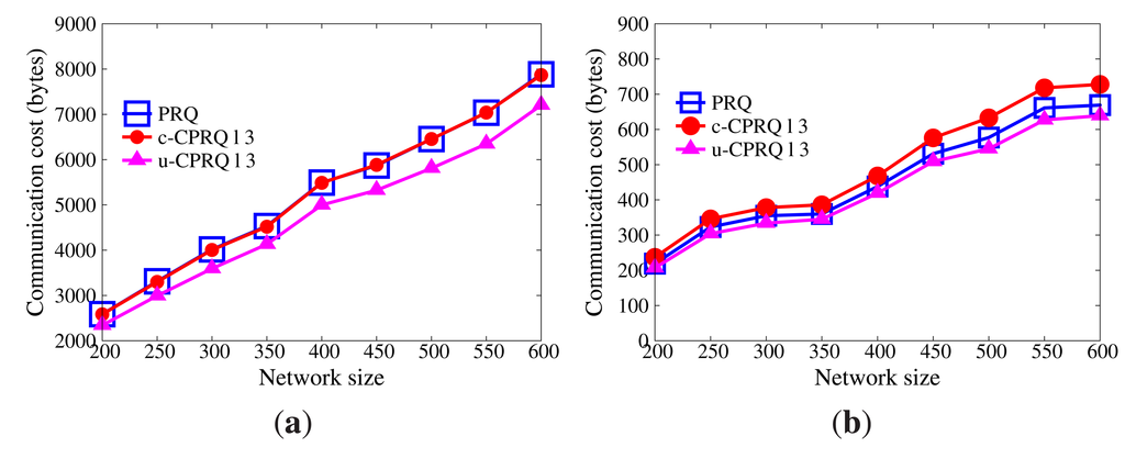 Figures 9 and 10 demonstrate the communication cost of the series of CPRQ protocols compared with PRQ. It is observed that the communication cost of sensor nodes in u-CPRQ is less than those in c-CPRQ and PRQ. Sensor nodes transmit all encrypted data and corresponding BFcodes to master nodes. Since the size of the encrypted part for each protocol is identical, the size of a compressed BFcode determines the communication cost of sensor nodes. Because the number of hash functions for data in u-CPRQ is less than those in c-CPRQ and PRQ, the size of a compressed BFcode in u-CPRQ is smaller than those of others. Besides, this shows that the communication cost of master nodes in PRQ is less than that in c-CPRQ, but is greater than that in u-CPRQ. Since c-CPRQ adopts a relaxed membership test, it produces more false positives than PRQ. The size of a compressed BFcode in u-CPRQ is smaller than that of PRQ, such that the communication cost of master nodes in u-CPRQ is less than that in PRQ.