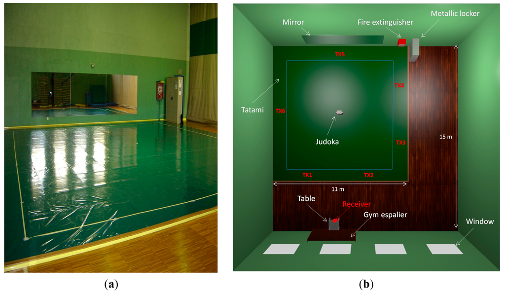 The dimensions of the whole scenario are 15 m (long) × 15 m (wide) × 8 m (height) and it has a typical morphology of a training venue, as it contains concrete walls, windows, a mirror, parquet flooring and some furniture elements as wooden gym espalier and table, metallic locker and a fire extinguisher inside a metallic box with methacrylate cover. Although most of the scenario is air, the existing furniture and the presence of people make it a complex indoor scenario in terms of radiopropagation. Figure 1 shows a picture of the real scenario where the measurements have been taken and the schematic scenario created for the later 3D ray-launching simulations, which represents the real Judo training venue.