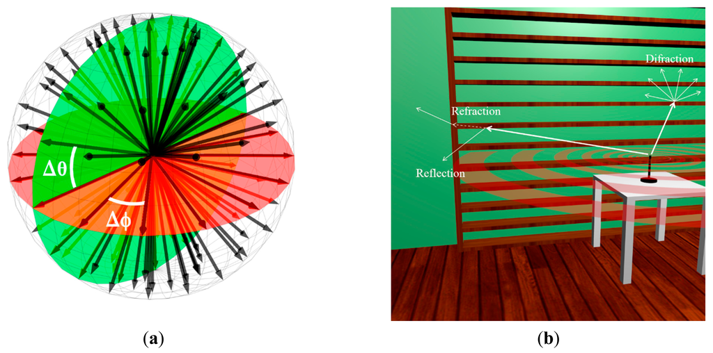 The algorithm is based on Geometrical Optics (GO) and Geometrical Theory of diffraction (GTD), with its uniform extension called as the Uniform GTD (UTD). The objective of these rays is to introduce proper field corrections, especially in the zero-field regions predicted by GO. The accuracy of the model is determined by the number of rays considered in the launched bundle and the distance to the transmitter to the receiver location. A test ray which scans a finite sample of the possible directions of the propagation from the transmitter is chosen and a ray is launched for each such direction. The number of launched rays is proportional to the dimension of the space considered. The illustration of the ray launching method is represented in Figure 10. When a ray impacts with an object, a set of a reflecting and a refracting ray is generated, and when a ray impacts a wedge, a new source of diffracted rays is created. The reflection coefficient has been computed from the classical Fresnel formula. The UTD coefficient empirically modified by Luebbers [33] has been used for diffractions.