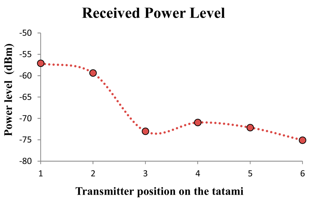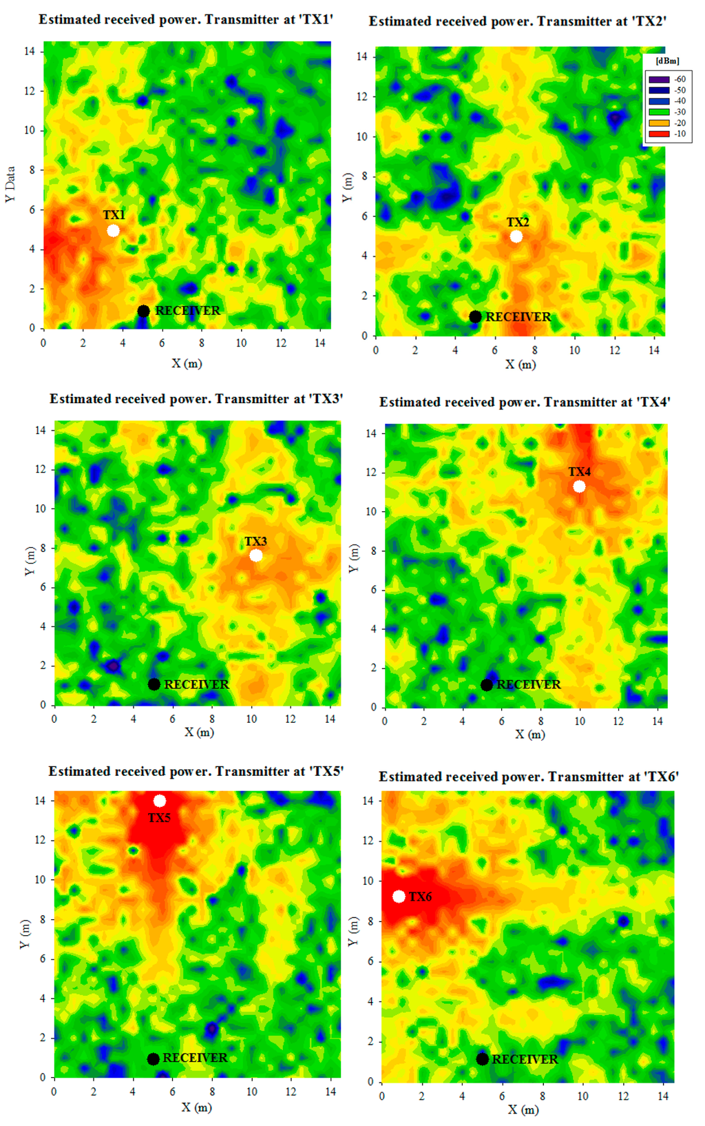 The measured power levels at receiver position for each of the mentioned six different positions of the transmitter along the perimeter of the tatami are shown in Figure 3. Thus, the radiopropagation from different distances can be analyzed. As can be seen in the obtained values, the distance between the transmitter and the receiver has an important impact on the received power, as it is expected. But it can be clearly seen how in some cases more power from further points (e.g., point TX4 versus point TX3) is received. This is mainly due to multipath propagation, which is the most relevant radiopropagation phenomenon within indoor environments.