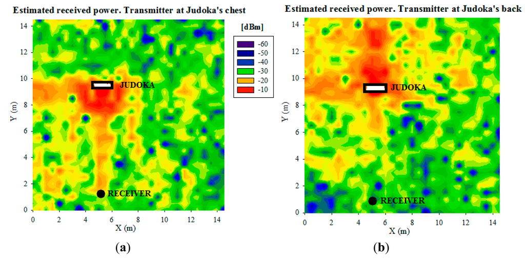 Figure 11 shows the obtained received power planes at height 0.75 m (the height of the receiver on the table), when the transmitter is placed on the tatami at the six positions shown in Figure 1b, without the presence of the judoka. Figure 12 shows the same results, but for the transmitter placed on the chest and the back of a standing judoka (facing the receiver) in the center of the tatami. Note that the previously mentioned detailed human body model created in-house has been used for these simulations. As can be noticed, received power level is dependent on the position of the transmitter and receiver devices, and the influence of the human body is also clearly seen. Besides, short term variations of the received power level can be seen throughout the scenario, that are mainly due to the multipath propagation, which is in most cases the strongest phenomenon in indoor environments. In order to gain insight in the computational cost of the simulation procedure, simulation times have been obtained for different cases, which are shown in Table 3. In all cases, the simulation results have been obtained with the aid of a workstation with 2 Xeon X5650 2.66 GHz processors, 64 GB RAM and Windows XP 64 bit operating system.