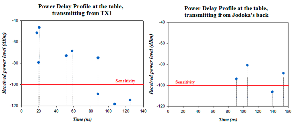 In order to see the impact of the commented multipath propagation in this scenario, in Figure 13 two power delay profiles obtained from the simulation results at the center of the table are presented. The transmitter positions have been chosen in order to see the different results that can be obtained depending on the position of the transmitter. These positions correspond to TX1 and the back of the judoka. The sensitivity of the XBee Pro modules (−100 dBm) has been delimited in the graph by a red line in order to see the components which will be taken into account and which ones will not be seen by the device. The complexity of the scenario is clearly seen, as many components reach the receiver due to the number of components that are created due mainly to reflections and diffraction. As expected, more components with higher power level reach the table from position TX1 than position on the back of the judoka, as the distance is shorter and no human body is affecting the propagation.