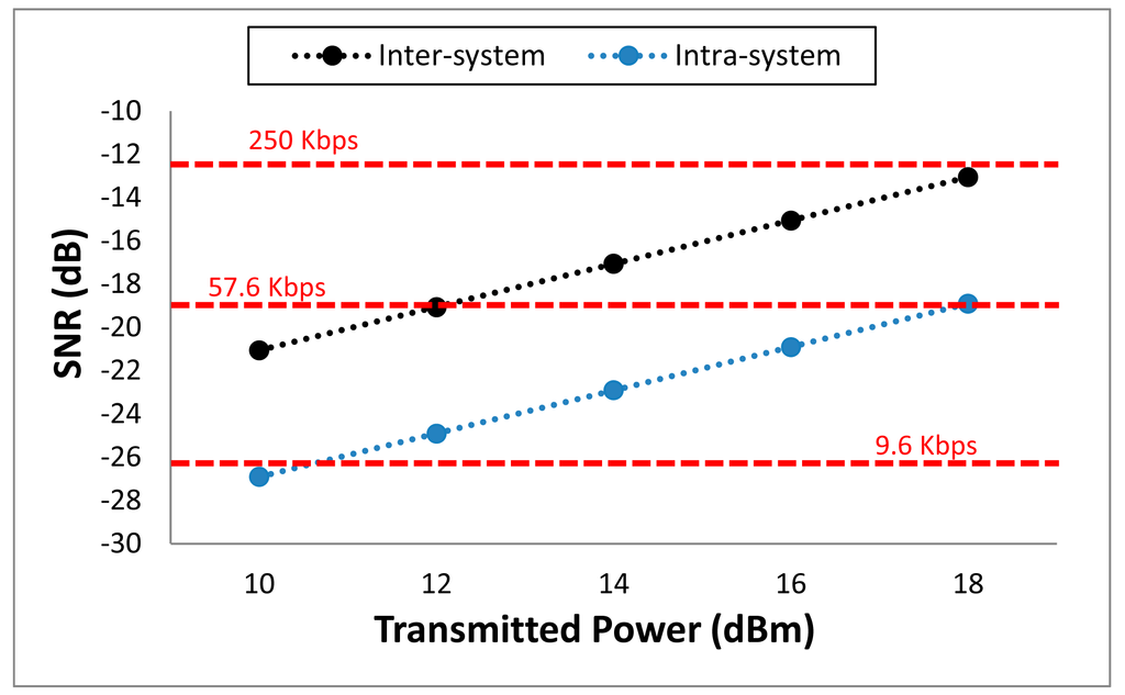 From the estimated received power values, link quality data can be obtained. Specifically, the SNR can be calculated at every point of the scenario. In Figure 15, as an illustrative example, a particular SNR study at receiver point for the transmitter on the back of the judoka is shown. This is the worst of the simulated cases as it is the lowest received power level. The values of the X-label are the predefined transmission power levels of the XBee Pro devices, so the SNR for each of these levels is depicted in the graph, both for intra-system (blue dots) and inter-system (black dots) interference. For the intra-system interference study, the power transmitted by the motes on the other parts of the body (chest, arm and knee) has been assumed as noise. For the inter-system interference, the interference sources are the motes placed on the tatami, emulating the interference produced by another wireless application. In both cases, it has been assumed that all the motes operate at the same frequency channel. As the SNR depends on the channel band width (3 MHz for ZigBee) of the utilized wireless system and the capacity, three red lines have been depicted in the graph, indicating the minimum SNR level required to operate at different transmission data rates (9.6, 57.6 and 250 Kbps). When transmitting at 250 Kbps, the typical highest data rate for ZigBee, the minimum SNR is not reached, even transmitting at higher power level. But typically, the data rate required for ZigBee applications is lower. For example, if the data rate is lowered to 9.6 Kbps, the SNR limit is easily overcome for most of the cases. This radioplanning analysis can be extended to other noise sources like WiFi devices or personal portable devices used by the people within the scenario.